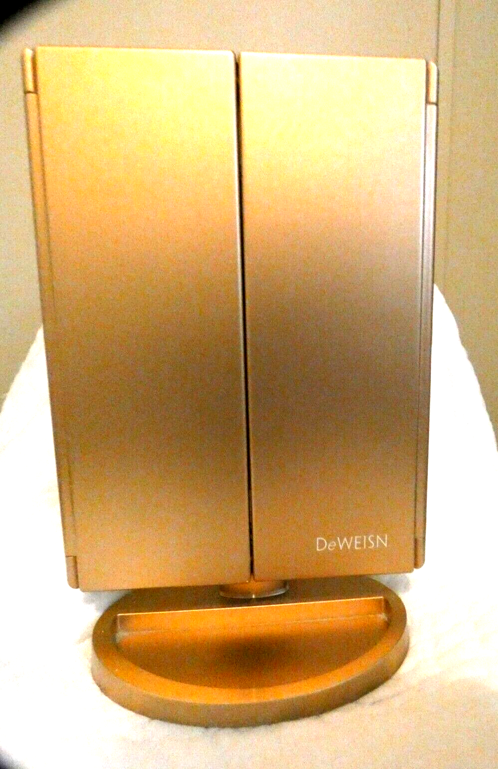 DeWeisn Tri-Fold Lighted Vanity Mirror with 21 LED Lights, Touch Screen and 3X/2X/1X Magnification, Uses 4 AAA batterys. Gold color base and frame. FC