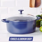 Forged Aluminum Construction: 50% lighter than cast iron with all the performance. Blue Diamond’s Signature Diamond-Infused Ceramic Nonstick: The ultra-durable diamond-enhanced ceramic coating is 5x harder and 10x longer lasting then traditional nonstick coatings, making it scratch-resistant and metal utensil safe Toxin-Free: Free of PFAS, PFOA, lead, and cadmium Cook & Look Dome Lid: This temperature shock-resistant cast glass lid gives you an easy look at your meals without losing heat The dutch oven rounded dome lid provides 85% more room than a traditional lid and promotes better airflow Huge Capacity—Fits a whole chicken! Oven and broiler safe up to 600°F, glass lid up to 350°F Dishwasher Safe For all stovetops, except induction Limited Lifetime Warranty