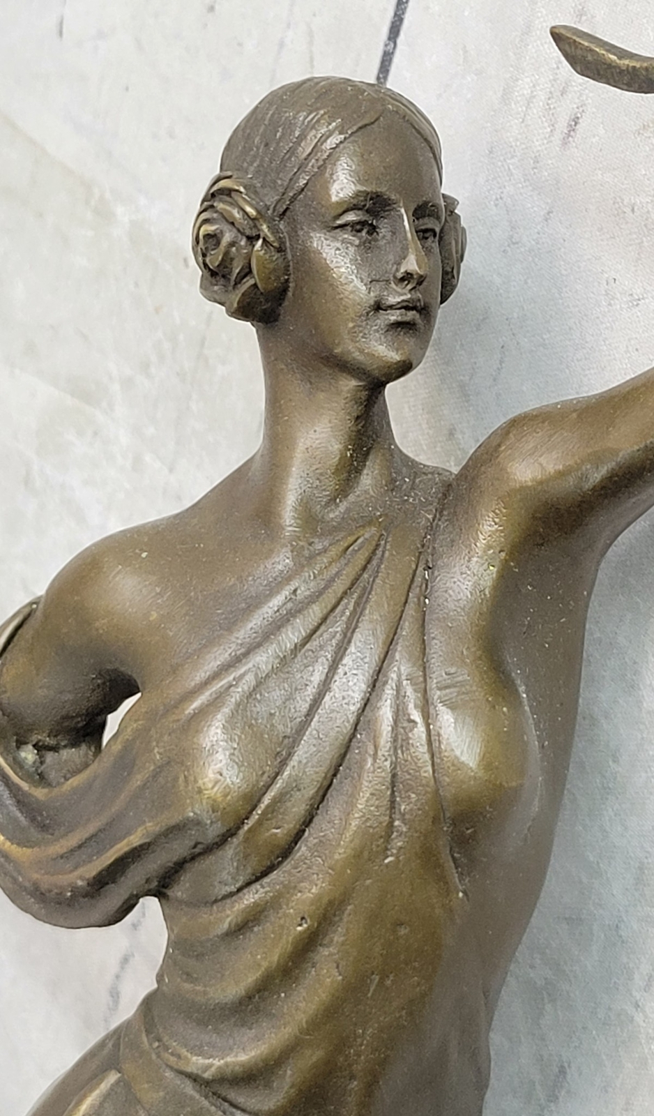 Condition : This sculpture is in perfect condition Bronze Dimensions with Marble Base: Height 17.5" X Width 7" Marble Dimensions: Diameter 5.5" Height without base:14" Weight:9 LBS Inventory:93YRD12434139 Dive into the rich artistic portrayal of the Greek goddess Diana with this intricately detailed sculpture by American artisan Fisher. Diana, a prominent figure in Roman mythology, embodies the spirit of the hunt, symbolizing a profound connection to the wilderness, wildlife, and the lunar sphere. Initially revered as the goddess of hunting, Diana was often accompanied by her youthful and graceful attendants, who joined her in the pursuit of prey. Over time, the Romans equated Diana with the Greek goddess Artemis, expanding her divine attributes to include those of a Moon goddess, complementing the domain of Luna. Honored in ancient Roman religion and revered in contemporary Religio Romana Neopaganism and Stregheria, Diana's influence remains significant, with dedicated shrines in Capua and Aricia, near Rome, serving as testaments to her enduring legacy. Regarded as the twin sister of the god Apollo, Diana is the daughter of Jupiter and Latona, exemplifying a formidable and respected deity within the Roman pantheon. Crafted with meticulous attention to detail, this stunning sculpture captures the essence of the legendary Diana, bringing to life the goddess's strength and grace. With a keen focus on artistic precision, the sculpture embodies the spirit of the hunt, showcasing Diana's connection to the untamed wilderness and her role as the protector of the woodlands. The intricate craftsmanship of the piece reflects the timeless allure and significance of Diana in Roman mythology, depicting her surrounded by the captivating energy of the hunt and the profound reverence for the natural world. As a powerful representation of divine femininity, Diana's portrayal in this sculpture is a testament to her enduring influence and cultural significance throughout history. Elevate your appreciation for classical mythology with this exquisite sculpture, a homage to the revered Greek goddess Diana. Crafted with the utmost dedication to artistic detail by American artisan Fisher, this masterpiece captures the essence of Diana's multifaceted persona, embodying her role as the goddess of the hunt, the protector of wildlife, and the revered lunar figure. The sculpture's intricate design and lifelike representation convey Diana's prowess and elegance, highlighting her influence over the natural world and her significance within ancient Roman mythology. With every meticulously sculpted detail, the sculpture pays homage to Diana's enduring legacy and her lasting impact on the realms of nature and the divine. Artemis Diana the Huntress Archer w/ Bow Bronze Sculpture Statue Figure YRD-1243nbsp; Video will open in a new window Using the eBay App? Paste link into a browser window: [isdntekvideo]