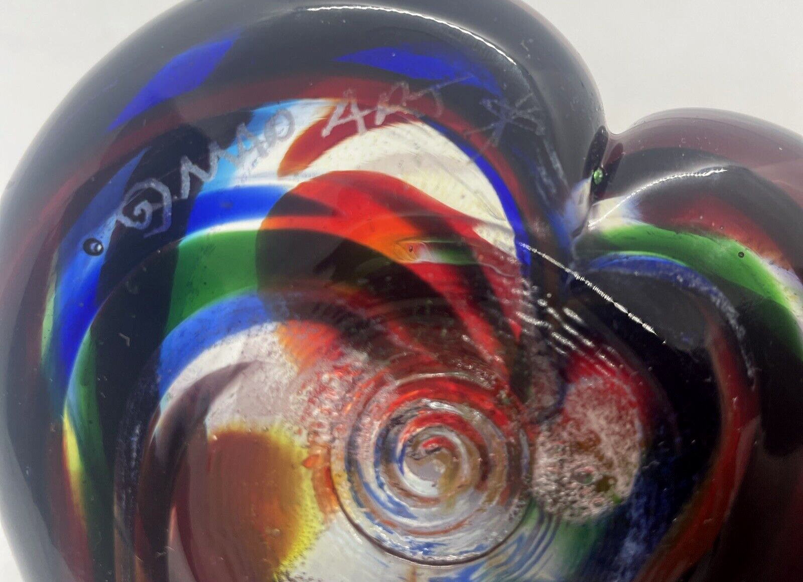 Mad Art Studios Dichroic Swirl Art Glass Heart Paperweight Signed This heart paperweight is in excellent pre owned condition. There are no chips or cracks. It measures 3.5" x 3.25" Please note the photos for detail.
