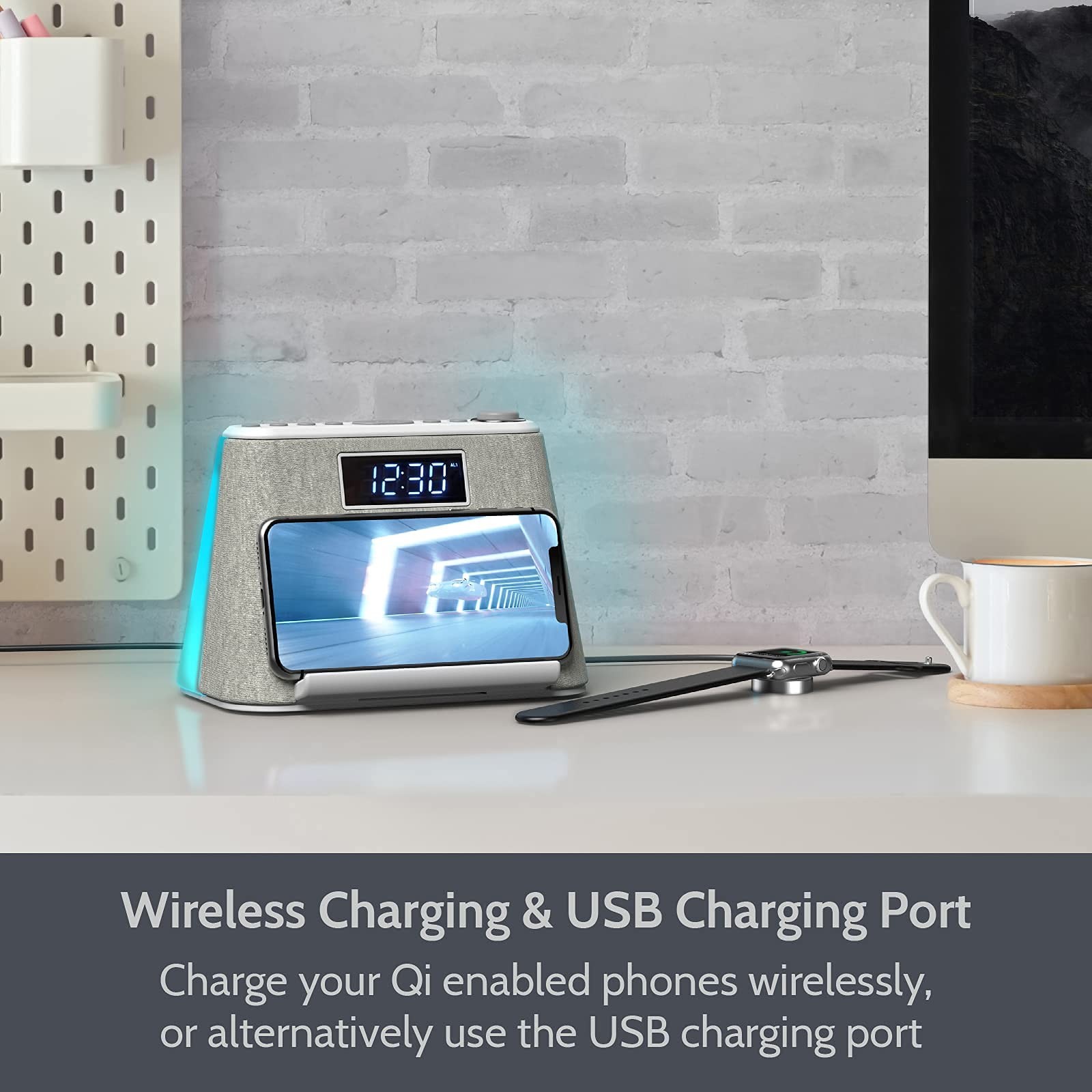 Digital Alarm Clock Radio, Bedside LCD Alarm Clock with USB Charger & Wireless QI Charging, Bluetooth Speaker, FM Radio, RGB Mood LED Night Light Lamp, Dimmable Display and White Noise Machine. ✔️ COMPLETE BEDSIDE HUB: From audio specialists comes the all-in-one bedside accessory, combining a Dual Alarm Clock with a Phone Dock, Wireless QI and USB Charging, Bluetooth Speaker, FM Radio, White Noise Machine and a handy RGB Nightlight with multiple color settings - all in a stylish modern fabric finish that looks great in any room. It’s slanted phone dock also makes it easy to watch movies, look at recipes or make video calls while your phone is charging. ✔️ CHARGE WHILE YOU SLEEP: With the Hub Radio Alarm Clock there is no need to charge your smart devices away from your bedside - the built-in QI Wireless Charging pad is compatible with all Qi-enabled phones so you can rest your device on the ledge for easy charging with no wires with a slanted viewing angle ideal for watching videos hands-free. It also has a 1A USB port is suitable for easily powering an additional device such as a second phone, power bank or smartwatch. ✔️ PACKED WITH FEATURES: Enjoy colorful atmospheric lighting with 6 ambient RGB settings - which can be set to cycle or stay on your favorite. Create your own mood light, background light, SAD light or reading light with a range of colors and brightness intensities to choose from. Also features an easy to set alarm with snooze function and the safety of a backup battery (2 x AA Not Supplied), in case of a power cut during the night so you can be sure to wake up on time. ✔️ BLUETOOTH SPEAKER, FM RADIO AND NATURE SOUNDS: With its built in 3W RMS output and easy Bluetooth pairing – you can easily play your favourite music or give a boost to your mobile videos. With an FM Radio, you can wake up to your favourite radio station whether it’s the morning headlines or music. Auto-save up to 10 pre-set stations so you can always have your selection ready. For a simpler selection, it also features 4 built in nature sounds such as flowing water. ✔️ BUY WITH CONFIDENCE: All products are designed and developed with our customers in mind which is why we offer a hassle-free 24-month warranty, easy return policy and friendly locally based customer service. The neat gift box includes 1 x Bedside Alarm Clock Hub, 1 x Power Cable and an easy to follow User Guide.