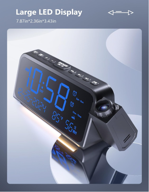 Projection Alarm Clock for Bedroom with Weekday/Weekend Mode, Digital Clock with 350° Rotatable Projector,5-Level Dimmer, Adjustable Volume, Temp & Humidity Monitor,Calendar,Snooze,12/24H,Battery Backup About this item LARGE LED DISPLAY: This alarm clock features a 5.9-inch ultra-clear LED display, making it easy to read the time even in the dark, whether you’re still half-asleep or not wearing your glasses. All setting buttons are easy to operate, even for kids or elders ULTRA-CLEAR ALARM CLOCK PROJECTION ON CEILING:This Projection Alarm Clock Provides a Crystal-clear Display of the Time on Your Ceiling or Wall. With an Upgraded Adjustable 350° Swivel Projector and a Rotating Focus Ring, It Ensures a Fine and Smooth Time Figure Image on the Wall or Ceiling at the Optimal Distance of 1.64-11.4ft (0.5-3 Meters). Easily Read the Time From Your Bed Without the Need to Touch Anything ADJUSTABLE BRIGHTNESS & VOLUME: This smart alarm clock has a 5-level adjustable brightness display, enabling you to easily read the time on our 5.9-inch ultra-clear LED screen. Specially designed loud alarm clock for heavy sleepers adults, featuring 7-level adjustable volume and progressive buzzer volume (45-116dB). It is friendly for heavy sleepers who aren't accustomed to sudden loud sounds, making it easy to wake you up DUAL CLOCKS FOR 4 WAKE-UP MODES: This alarm clock for bedrooms boasts a dual alarm function, enabling you to set two independent wake-up times for the same day—one for yourself and another for your partner. Additionally, it offers four different operating modes: weekend, workdays, all seven days, and a one-time setting, ensuring that you can adhere to your work schedule while also enjoying some extra sleep on weekends. It caters to various demographics and is user-friendly for kids, seniors, or the elderly INDOOR TEMPERATURE & HUMIDITY MONITOR: The projection clock for bedroom ceiling is equipped with a professional, high-precision indoor temperature and humidity monitor. This feature helps you accurately track indoor temperature and humidity, safeguarding you and your family from issues caused by excessive dryness or humidity. It assists in creating a comfortable indoor environment and lets you know whether adjustments are needed 12/24 HOUR & DST TIME FORMAT & 9-MINUTE SNOOZE: Our clock for bedroom features a uniquely designed 12/24 Hour & DST button, allowing you to choose your preferred time format or activate DST time. Gain comprehensive knowledge of this clock projector by reading our detailed instructions within 1 minute. When the alarm goes off, press the large SNOOZE button on top to enjoy an additional 9 minutes of precious sleep before the next alarm cycle 2 CHARGING PORT& BATTERY BACKUP SETTINGS: Plug in AC power(100-240V) to make this alarm clock work, not battery operated, and it has 1 USB charging port and 1 Type-C for your other electronic devices such as cellphone and tablet etc., no need to charging your device by using an extra plug. Install 2 AAA batteries(not included) to get the backup of your personal settings for memory backup, so you won't lose your settings of time and alarm in case of a power outage
