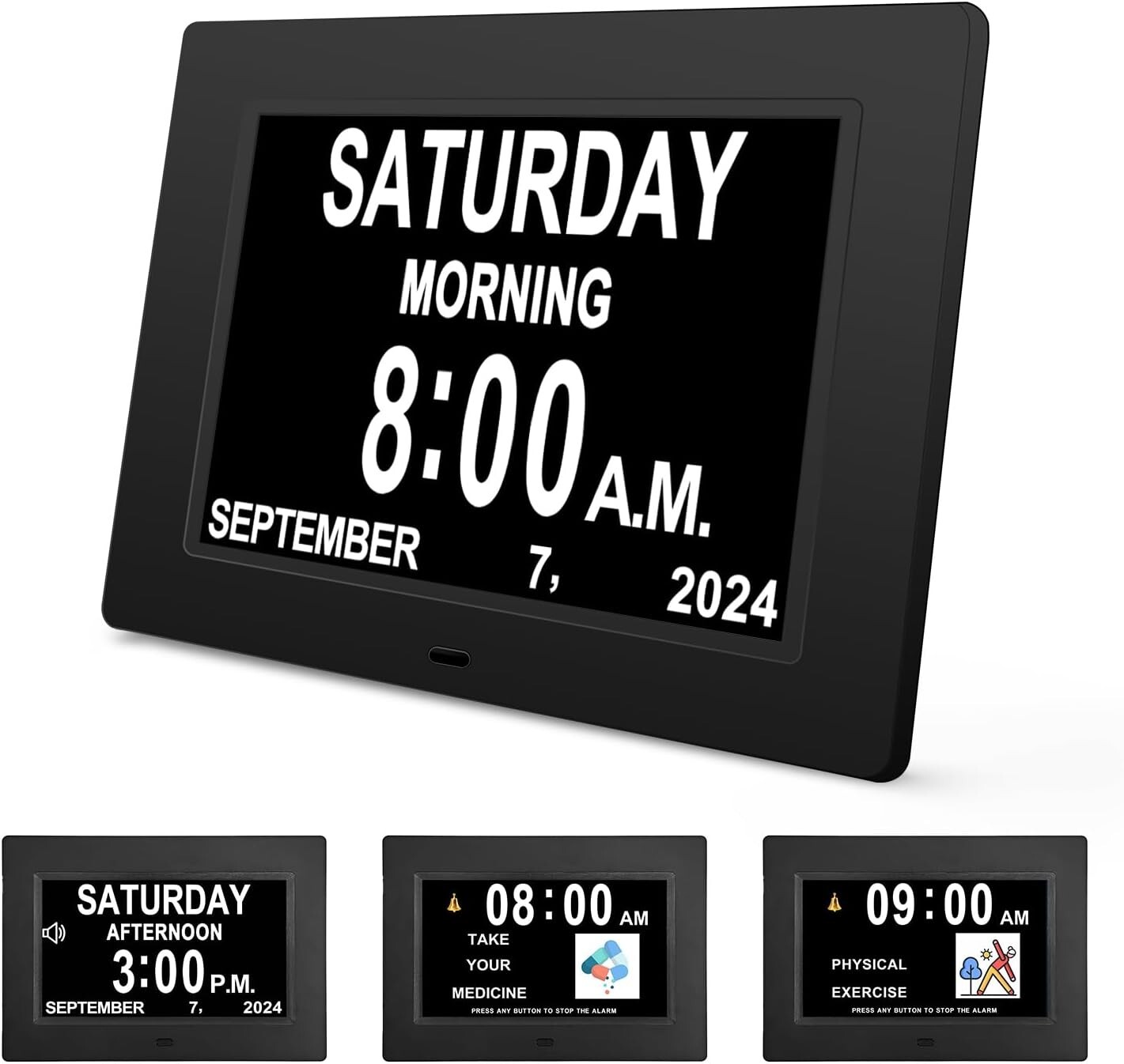 Digital Calendar Clock with 12 Alarms & Reminders - Perfect for Impaired Vision ‹ › ‹ › ‹ › ‹ › ‹ › ‹ › ‹ › ‹ › Digital Calendar Clock with 12 Alarms & Reminders -Perfect for Impaired Vision Features: 7-inch high resolution large screen display Clear display of time, date, month, and year Visible from a distance 12 separate alarms & reminders available Helps seniors with medication, doctor appointments, exercise, and afternoon tea Hourly chime for impaired vision and dementia Auto-dimming option with 3 levels Ideal gift for elder parents Simple UI settings with only 7 control buttons Benefits: Easy to read time and date from a distance Helps seniors stay organized and remember important tasks Assists impaired vision and dementia patients in knowing the correct time Adjustable brightness for comfortable viewing at night Great addition to any home User-friendly design for easy operation Why choose our Digital Calendar Clock? Don't let impaired vision or memory loss hinder your loved ones' daily routines. Our Digital Calendar Clock is the perfect solution, featuring a large 7-inch screen that clearly displays the time, date, month, and year. With 12 alarms and reminders, it's easy for seniors to stay on top of medication schedules, doctor appointments, exercise routines, and afternoon tea breaks. Designed with impaired vision and dementia patients in mind, our clock offers an hourly chime to help them keep track of time. The auto-dimming option ensures the brightness adjusts throughout the day, preventing it from being too bright at night. It's the ideal gift for elder parents, making it much easier for them to see the time from a distance. With a senior-friendly UI and simple control buttons, our Digital Calendar Clock is incredibly easy to use. Say goodbye to confusion and frustration - order your clock today and make life easier for your loved ones. Shipping Free & Fast Shipping - We offer free shipping to most of the USA with a normal delivery time of 3-7 days. However, due to the current situation, additional delivery time (up to 3 weeks) may be required for some items. Alternative Carriers - We may use alternative carriers (e.g. USPS, FedEx, UPS, etc.) to ensure your package arrives safely and on time. Due to the use of multiple carriers, we are unable to provide a tracking number automatically. Handling Time - Orders are processed and shipped within 1-2 business days of receiving cleared payment. Shipping Restrictions - Shipping to Alaska, Hawaii, Puerto Rico, Guam, and other US territories may incur shipping charges or delivery restrictions. Please contact us before ordering, or your order can be refunded/cancelled. State Restrictions - There may be restrictions based on your state of purchase. For example, certain items may not be shipped to California due to state regulations. Contact for Tracking Updates - If you require tracking updates or have any concerns about the delivery of your order, please feel free to contact us, and we will be happy to assist you. Return 30-Day Hassle-Free Returns - We want you to be completely satisfied with your purchase. If you are not, you can return the item within 30 days of receiving it for a full refund or exchange. Easy Return Process - To start a return, simply contact us and we will provide you with a prepaid return shipping label and detailed instructions. Restocking Fee - There are no restocking fees for returns. However, the buyer is responsible for return shipping costs if the return is not due to a seller's error. Refund Processing Time - Refunds will be processed within 5 business days of receiving the returned item in its original condition. Payment We accept all major credit cards, PayPal, and Apple Pay for your convenience. Your payment information is secure and encrypted to ensure a safe and seamless transaction. Please complete your payment within 3 days of purchase to avoid any delays in shipping. Feedback Your feedback is extremely important to us. We strive to provide the best products and customer service possible. If you are satisfied with your purchase, please take a moment to leave us a positive review. If you have any concerns or issues with your order, please contact us before leaving negative feedback. We are committed to resolving any problems and ensuring your satisfaction. Contact Us If you have any questions or concerns, please feel free to reach out to our customer support team. You can contact us through the eBay messaging system. We are available Monday to Friday, 9:00 am to 5:00 pm EST, and we will do our best to respond to your inquiry within 24 hours. Thank you for supporting our small family business!