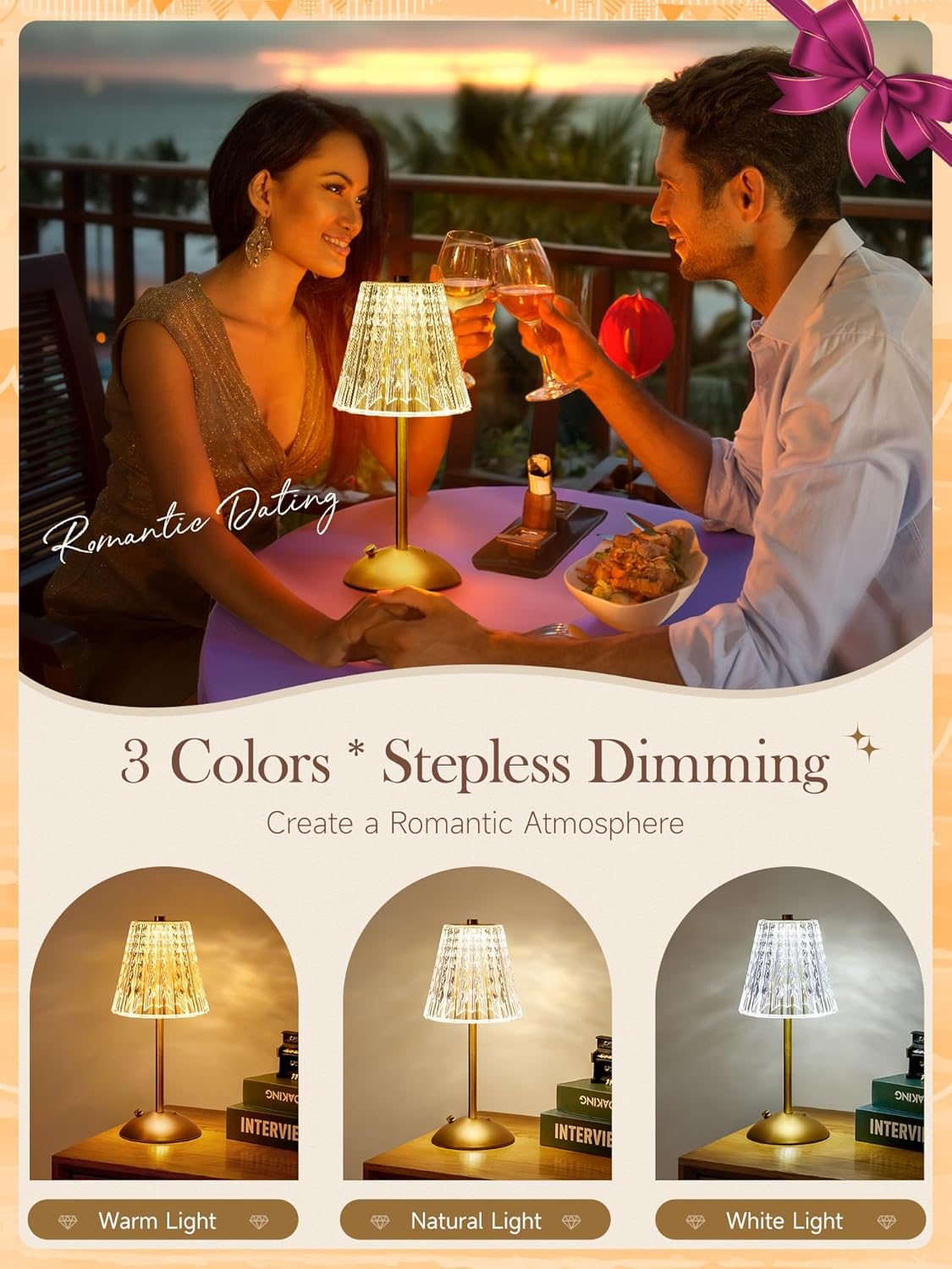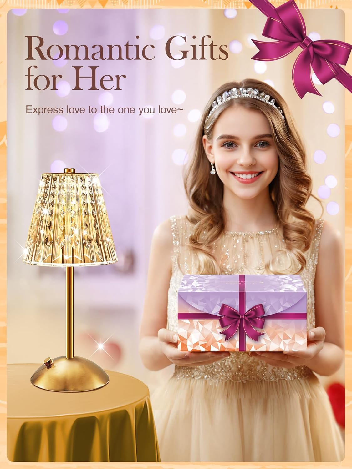 🎀Beautiful Gift Packaging: The upgraded gift box is equipped with a ribbon, meet your needs for beautiful gift packaging to convey your love to yr kids/fris/family! Vintage & Romantic & Cordless Crystal Lamp will better express your love for your girls. When they receive this cute gifts, you will see their sweet smiles. -If you have requirements for the packaging of the Vintage lamp/if you are giving it to someone else, please take this small table lamp/ cordless lamp/ rechargeable lamp/ battery powered lamp/ touch lamp /kitchen lamp Home. 🌹3 Colors Romantic Crystal Lamp: The romantic crystal lamp has 3 colors: Warm Light, White Light & Natural Light. Crystal table lamp can be adjusted according to yr mood. Crystal table lamp with shiny diamond crystals & advanced metal look so luxury and classy. Crystal lamp reflects relaxing & 3 colors comfortable lights, show the gorgeous temperament, decorate yr bedroom & living room, create a comfortable & romantic atmosphere. Nightstand lamp is very lightweight and the base is very sturdy! 🌹Dimmable & Easy Touch Control Cordless Lamp: Cordless lamp has Stepless Dimming & Sensitive Touch Control. Just touch the metal button to change the brightness of cordless lamp from bright to a soft glow, crystal lamp/cordless lamp suitable for all kinds of scenes. Flicker-free to protect your eyes. Low light- as a nightstand lamp for midnight use, no worry to fumble switch. Medium light- for normal use or decor. High light- bright enough for beside reading or use as a desk lamp for studying or work. Just take this wonderful vintage kitchen lamp/cordless lamp/ rechargeable lamp/ battery powered lamp/ cordless table lamp/ touch lamp /rechargeable table lamp home!!! 🌹Rechargeable & Cordless & 2000mAh Crystal Table Lamp: Crystal Lamp Built-in 2000mAh battery with Type-C charging port, charges anytime, no longer worry about a power outage & wasting money on battery. The fully charged battery of crystal lamp/battery powered lamp/cordless lamp/small lamp/rechargeable lamp can work up to 12 hrs(at minimum brightness), crystal table lamp accompany U all sweet night. The natural and elegant crystal table lamp appearance allows it to be placed anywhere in the house. At night, crystal lamp is a Romantic & Beautiful Crystal Light. 🌹No Installation & Luxury Romantic Crystal Lamp: R u worried about the trouble in assembling the Cordless lamp? Crystal lamp can be used immediately at home! Crystal lamp made by premium quality material-Acrylic, Crystal Lamp with smooth edge line, protect yr hands.The lampshade triangle design reflects Relaxing&Romantic lights with beautiful sparkles, catching every romantic moment. Shiny Crystal lampshade&Gold texture design is versatile for any accasions & a perfect teen girl bedroom decor 🌹Crystal table lamp creating an unique fascinating effect, Crystal table lamp is perfect for your lover, family, friends, as a Christmas Gifts, Valentine's Gifts. Suitable as a nightstand lamp, bedside lamp and office lamp to spruce up yr bedroom living room, dining room, closet, office, guestroom or study room. ONEFIRE glam crystal lamp/crystal table lamp/cordless lamp/small Lamp/battery powered lamp/cordless lamp/bathroom lamp/kitchen lamp/rechargeable lamp comes with a 3 years quality promise. Just take a shiny crystal lamp home,ONEFIRE provides u strong quality promise Product Description Two usage methods: can be [charged] or [plugged in] for use~ Short press the metal button of the crystal lamp to control the color. Long press the metal button of the crystal lamp to control the brightness. Crystal table lamp/bedroom lamp/kitchen lamp/bathroom lamp/ dinning bar lamp/cordless lamp for emergency~ Vintage Romantic Crystal Lamp Crystal lamp shines like a diamond without losing its special 3D technology. The refraction crystal lamp is bright and colorful. Crystal Gold Lamps Sturdy metal lamp pole of crystal lamp, the base is very sturdy! High quality crystal lamp. Easy Touch Control Crystal Lamp Short press the button to adjust 3 Colors (Warm Light, White Light, Natural Light). Long press the button to control the brightness (stepless dimming) Rechargeable Crystal Lamp Built-in 2000mAh battery with Type-C charging port, charges anytime. Nightstand lamp is very lightweight and the base is very sturdy! Crystal Lampshade Gold Metal Lamp Pole Easy Touch Control Type-C Charging Port Romantic & Sleek Christmas Gifts for Girls ROMANTIC GIFTS --- Share Romance & Express your Love~ Romance comes from heart, Romance comes from surprise, Romance needs action, and Romance is to give her the Beautiful Crystal Lamp! One Fire Crystal lamp, a wonderful/thoughtful Romantic Gifts for Girls, Lovers, Family, Friends~ No hesitation to tell us if you are met with problems of ONEFIRE Crystal Lamp. Just take a Crystal lamp, Crystal table lamp home, ONEFIRE BRAND provides you strong quality promise.