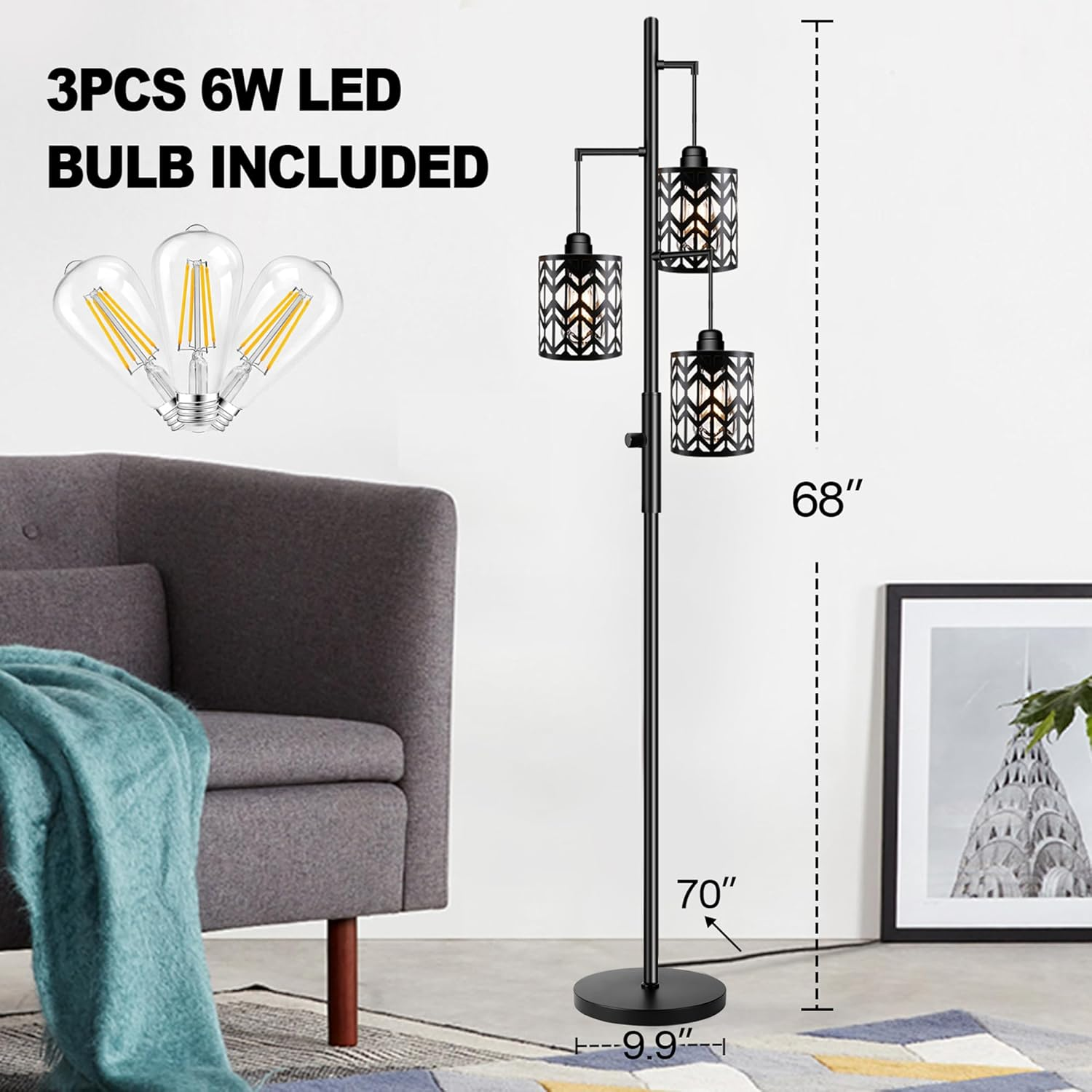Store New Arrivals Add to Favorite View Feedback Contact Dimmable Floor Lamp, Industrial Standing Floor Lamp for Living Room, Tall Farmhouse Rustic Lamp with 3 LED Bulbs, Tree Floor Lamp for Bedrooms, Living Room, Home Office, Metal, Black, 68" Description Item model number RODLLDD24314 Light Source Type LED Style Dimmable-Black2 Power Source Corded Electric Number of Light Sources 3 Control Method Touch Batteries Included? No Lighting Method Adjustable Mounting Type Pole Mount Lamp Type LED Number of Pieces 3 Room Type Office, Bedroom, Living Room, Dining Room Bulb Shape Size A19 Installation Type Freestanding Product Dimensions 17.32"D x 13.78"W x 7.68"H Material Metal Efficiency Highly Efficient Controller Type Foot Control Finish Type Polished Specific Uses For Product Indoor use only Indoor/Outdoor Usage Indoor Brightness 2000 Lumen Is Waterproof False Water Resistance Level Not Water Resistant Batteries Required? No Item Weight 7.1 Pounds Connectivity Technology USB Connectivity Protocol Homeplug Special Features 3 Light, Dimmable Special Feature 3 Light, Dimmable Shade Height 6.68 Inches Part Number RODLLDD24314 Shade Color White Color Temperature 2700 Kelvin Color B-Black Wattage 6 watts Is Cordless? No Base Material Metal Bulb Base E26 Shape Straight Voltage 1.2E+2 Volts (AC) Recommended Uses For Product Reading, Decoration Shade Material Metal Finish types Polished Included Components Bulb Switch Type Rotary Stepless dimming floor lamp( 0-100% ): this tall lamp for the living room is updated with a step-less dimmable and rotary switch to control the brightness. Just simply twist it and then you can adjust the stand up lamp in the brightness range of 0 to 100% according to the needs of different scenes. LED bulbs included: for your better user experience, these boho floor lamps provide 3 PCS 6W dimmable LED bulbs. Three bulbs emit 2000LM 2700K warm light in total and only consume 6W. The premium bulbs are non-flickering, have soft light, and have a longer lifespan. Elegant and unique appearance: if you want to decorate your home, this bright floor lamp will be a good choice. It is equipped with 3 beautiful hanging rattan cages which can add a decorative effect to your room. These industrial stand-up lamps are perfect for general indoor areas which include the Dining room, Living Room, Bedrooms, offices, Kitchen, Corridor, Cafe, Basement, Bar, and Club. High-quality material & sturdy metal base: this 3-light floor lamp is made of high-quality materials to create a heavy, stable base and light pole to ensure stability even on the carpet. They are firm and heavy-duty, never bent. The base is reliable enough, don’t mind falling down because of a sign of disturbance or trouble. Easy installation: comes with all mounting hardware for quick setup, our modern floor lamps are very easy to install. No complex procedures, so you can enjoy beautiful light right away. Product Description Elegant teardrop cage It is equipped with 3 beautiful hanging cages which can add a decorative effect to your room. These industrial stand-up lamps are perfect for general indoor areas Sturdy base The heavy-duty sturdy base makes this column floor lamps always stand up without tipping and shaking, making it safer for indoor use. Dimmable switch The dimmable tall floor lamp allows you to adjust the brightness of the lamp to suit your needs. With its simple shade and body, it can match many different styles and is the best choice to decorate your home. Great Choice for Different Home Decors This industrial modern floor lamp uses a black finish to make the lamp easier to clean, high quality and not easy to fade. It can be compatible with different furniture styles so you don't have to worry about whether it matches the style of your home. Soft Lighting Care for Your Eyes When you turn on this corner floor lamp, the soft light can make your home full of warmth and coziness. In such a beautiful atmosphere, you can relax yourself on the sofa after a long day of work and feel the beauty of life. The perfect gift choice This floor lamp is beautiful and practical, and is a necessity for home decoration. When you want to give gifts to friends, lovers or children, this tree floor lamp will be a good choice ABOUT US We’re dedicated to bringing you great deals on quality products. From home décor and garden essentials to tools, hardware, and pet accessories, our store has something for everyone — all at prices you’ll love. SHIPPING We ship all orders directly from the USA for fast, reliable delivery. Most items ship within 1 business day and include free shipping to the lower 48 states. For international orders, we use eBay’s Global Shipping Program — simply continue checkout to see costs, duties, and taxes for your country. FREE RETURNS We offer a 30-Day Return Policy on items which you are not completely satisfied with. You have the option for a full-refund or an exchange of the item. CUSTOMER SATISFACTION We do everything we can to ensure every customer is 100% satisfied. If something isn’t right, just send us a message — we’ll make it right quickly!