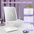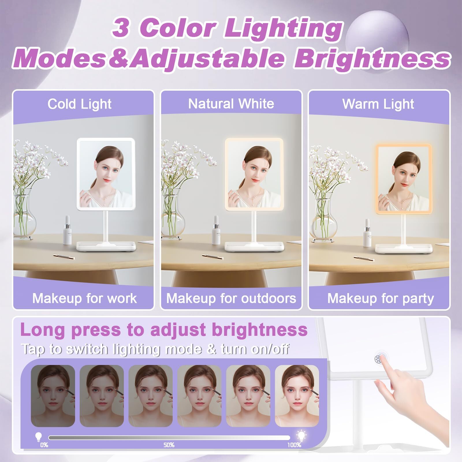 3 Color Modes & Dimmable large makeup mirror with lights: The LED mirror makeup equips with one-button touch to adjust 3 colors (warm/natural/cold light) and dimming (10%-100%) to provide perfect lighting for makeup application, light up mirror for makeup helping you to finish a flawless professional makeup suitable for any occasions Upgrade Brightness: Most of the led makeup mirrors with light bars on the market only have few light beads, which makes the lighting is not enough. We have improved on this for our makeup mirror with light! We have a whole line of lamp beads, which greatly improving the brightness of the mirror with lights for makeup desk. The brightness can be adjusted to meet your personal makeup needs Smart Touch Control and Rechargeable: Smart touch buttons for this light-up vanity mirror Simply short press power ON/OFF & change the light color, and Long press to adjust the brightness. We keep all the Functions the one touch for this makeup mirror for desk. The rechargeable makeup mirror with lights has a built-in battery that can be charged using the included USB charging cable, making the desk makeup mirror very convenient to use Ultimate mirror for makeup: Hollywood vanity mirror with lights is perfect for any girl/woman. You will fall in love with this makeup light mirror at first sight. The mirror makeup is both beautiful and practical. It is the be-st makeup vanity mirror for daughters, girlfriends, fiancees, wives and other girls and women who pursue beauty on Valentine's Day, Christmas, birthdays and other important days Easy Installation & Height-increasing base: No tools required, installation or removal can be completed in one step. You'll get a stable desk lighted mirror makeup vanity. 360° rotatable, large lighted makeup mirror can be fixed at any position as needed. 14.15 "L x 7.48 "W perfect size dressing mirror with Height-increasing base, providing you with the perfect perspective