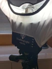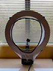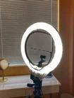 Diva Ring Light Nova. About 14inch diameter of the inner circle and 19inches across the entire ring. Comes with Diffusion cloth. Easy Plug in! Can fit on a universal tripod.