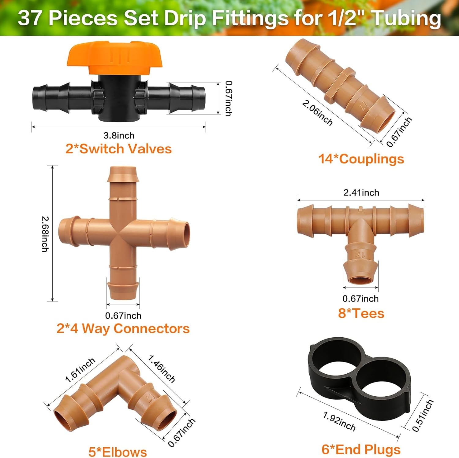 Drip Irrigation Fittings Kit for 1/2" Tubing, 37 Pieces 1/2 Inch Drip Line Co... ouplings, 8 tees, 5 elbows, 6 end closure, 2 cross connectors and 2 drip valves. This set of drip irrigation parts can meet all the need for 1/2" drip irrigation hose connection. 【PERFECT MATCH 1/2 INCH IRRIGATION TUBING】iRunning 1/2 inch irrigation fittings can work with most of the standard 1/2" drip irrigation tubing. (Note: Please check the size of tubing carefully before purchasing.) 【MADE OF DURABLE PLASTIC MATERIAL】iRunning drip line connectors are made of high quality engineering plastics, so our irrigation fittings are durable, strong, water resistant, chemical-resistant and long-lasting than others. 【EASY TO INSTALL】It is easy to install without any glue, tools or clamps. Simply push the tubing over the barbs, the barbed ends can grab 1/2" tubing tightly for a secure leak-proof connection. 【WIDE APPLICATION】These drip irrigation fittings for 1/2 inch sprinkler hose is ideal for garden, flower bed, greenhouse, farm, lawn, patio and other agricultural watering system. Shipping We offer FREE shipping on all orders! We ship within Three business days of payment, usually sooner. We use a selection of shipping services such as UPS, FedEx, USPS etc. We only ship to the lower 48 states, no APO/FPO addresses or PO Boxes allowed. Local pickups and combined shipping options are not provided at this time. Return You can return a product for up to 30 days from the date you purchased it. Any product you return must be in the same condition you received it and in the original packaging. Please keep the receipt. Customer satisfaction is very important to us. If you have any problem with your order, please contact us and we will do our best to make you satisfied. Contact Us If you have any queries, please contact us via ebay. We usually respond within 24 hours on weekdays. Please visit our eBay store to check out other items for sale! Thank you for shopping at our store.