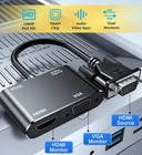 VGA to HDMI Adapter 2 in 1, VGA to HDMI+VGA Adapter Splitter for dual monitors, 2K60HZ Full HD Display Video Converter for PC/Laptop to Big Screen(Monitor/HDTV/Projector), Comatible with Mac OS, Windows, Linux 【VGA to HDMI+VGA Adapter】:Our 2-in-1 VGA to HDMI and VGA Adapter allows you to connect two external monitors at the same time via HDMI and VGA port for extending or mirroring, but if you using both ports simultaneously then the two monitors will only show the same contents. 【Full 1080P HD Resolution】: This VGA to HDMI +VGA splitter supports video & audio transmission from PC/Laptop to Monitor/HDTV/Projector without delay/lag. Both HDMI and VGA ports can achieve resolution up to 1920x1080P60HZ, The HDMI ports supports 2K HD (2560x1440@@60HZ). 【Plug & Play, Broad Compatibility】: This aluminium VGA adapter for monitors is very easy to use, just plug and play. Compatible with Windows, Mac OS, Linux and other systems. It's suitable for all PC and laptops with VGA port. 【With Auido & Power Port】: This product is equipped with a 3.5mm audio interface, which can connect audio devices such as speakers, amplifiers, headphones, etc. It supports PCM2.0 audio format and 2.1 channels, allowing you to experience a surround sound speaker. It also comes with a 5V/1A Micro USB power supply interface and is equipped with a power cord to avoid unstable image transmission caused by insufficient power supply. 【Durable and Portable】: Aluminum frosted shell, which has the advantages of anti-skid, wear-resistant, anti-scratch, etc. This VGA adapter is easy to carry on a business trip in your laptop bag. You can expand the computer screen to a large screen(Projector/Monitor) for presentation. It is super convenient for meetings and family entertainment. 【What Included in Package】: 1* VGA to HDMI+VGA adapter; 1* micro USB to USB charging cable; 1* 3.5mm to 3.5mm audio cable.