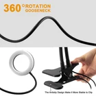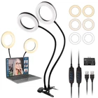 Double Selfie Ring Light 3 Color Modes, 10 BrightnessLevels:cold light/natura light/warm light;10 brightness levels adjustment from 10%-100%. 360° Rotation Angle:Our ring light can provide a 360° rotation angle, allowing you to find the best angle to illuminate your subject, making your photos or live broadcast better. Adjustable Clip:This metal clip can be clamped on a table with a maximum thickness of 5 cm, so this lamp can be widely used in desk, dressing table, wardrobe, furniture, headboard, etc. Convenient USB Supply:Works with most devices that support USB port(5V), like laptop, PC, power bank, USB charger, AC adapter, and etc. High Quality Details:dual 6-inch ring lights, gooseneck arms, adjustable clip, 55-inch USB cables. Widely Application:beauty make-up, video recording, live streaming, online Teaching" 【Double ring lights】Come with 2 independently controlled 6" ring lights,each light has 3 color modes(warm,natural,cold) and 10 brightness levels.The double ring light can provide you with enough light from different angles,make you look brighter and more energetic. 【Flexible Arm & Strong Clip】 Thickened gooseneck arm can stably stay in the position what you want,and 360-degree free bending allows you to easily adjust the angle or height of the ring lights. The strong clip allows you to clip the lamp where you want, such as table, bedside, bookshelf, etc. 【USB Ring Light】The desktop ring light compatible with most devices with USB ports, such as PC, laptop, power bank, USB charger, etc.Recommend 5V2A to get better brightness.Comes with a 2-in-1 USB charger, 2 ring lights only need 1 USB port. 【Clip on Ring Light 6 inch 】Compared with the 3.5-inch clip light, the 6-inch clip light has less glare, better brightness and better heat dissipation, especially we use the aluminum alloy shell. Better heat dissipation can extend the life of led lights. You can use it without any worries. 【Multiple Applications】 The double ring light with clamp can be used for video conference, live streaming, video recording,online teaching, make-up,crafting, drafting, reading, writing, nail art, tattoo, workbench. Suitable for home, office, college dorm, studio, workshop and so on.