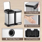 Dual Trash Can, Stainless Steel 2 x 5 Gal (2 x 20L) Garbage Can, Double Steel Pedal Recycle Bin with Lid and Inner Buckets, Rectangular Hands-Free Kitchen Trash Can Silence & Soft Closure: The soft-close lid ensures the environment remains peaceful, the design of internal hinge prevents the lid from bumping the wall. No loud slamming to be heard. Cleaner Kitchen Environment: The stainless steel material resists fingerprints and the spread of dirty things without dulling the natural sheen and luster of the steel. Bottom seal, enjoy a cleaner environment. Hands-Free Operation: This kitchen trash can with strong steel pedal. It’s hard to open the lid of a rubbish bin with your hands when you are busy in the kitchen. The pedal-type garbage can solves this problem well, letting you have your hands free to tuck away your waste. Standing Function: While the manual cover opening angle is greater than 90 degrees, it's convenient for kitchen use or peeling. (Note: The cover cannot be opened for a long time when the foot is less than 90 degrees, and it can be opened and closed when the foot is pressed.) Dual Compartments Garbage Can: Double compartments & pedal design, dry and wet classification, recyclable and non-recyclable classification. 2 compartments side by side, you can sort the garbage with a simple toss. All you need to do is to step on the pedal to open the lid, and now you have your hands free to throw away the recycling.