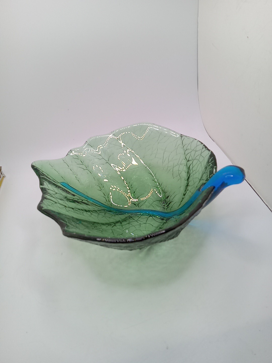 This beautiful Dynasty Gallery Serving Bowl is perfect for any occasion. Its vintage/retro style and shiny finish make it a great addition to your dinnerware collection. The bowl features a lovely green color with a blue stem and a grapevine leaf pattern. Measuring 2.5 inches in depth and 6.5 inches in width, this small leaf bowl is perfect for serving snacks or small dishes. The bowl is made of high-quality glass and is suitable for all occasions. Add this unique piece to your collection today! No chips or cracks, please see my other auctions for my other thrift store finds.