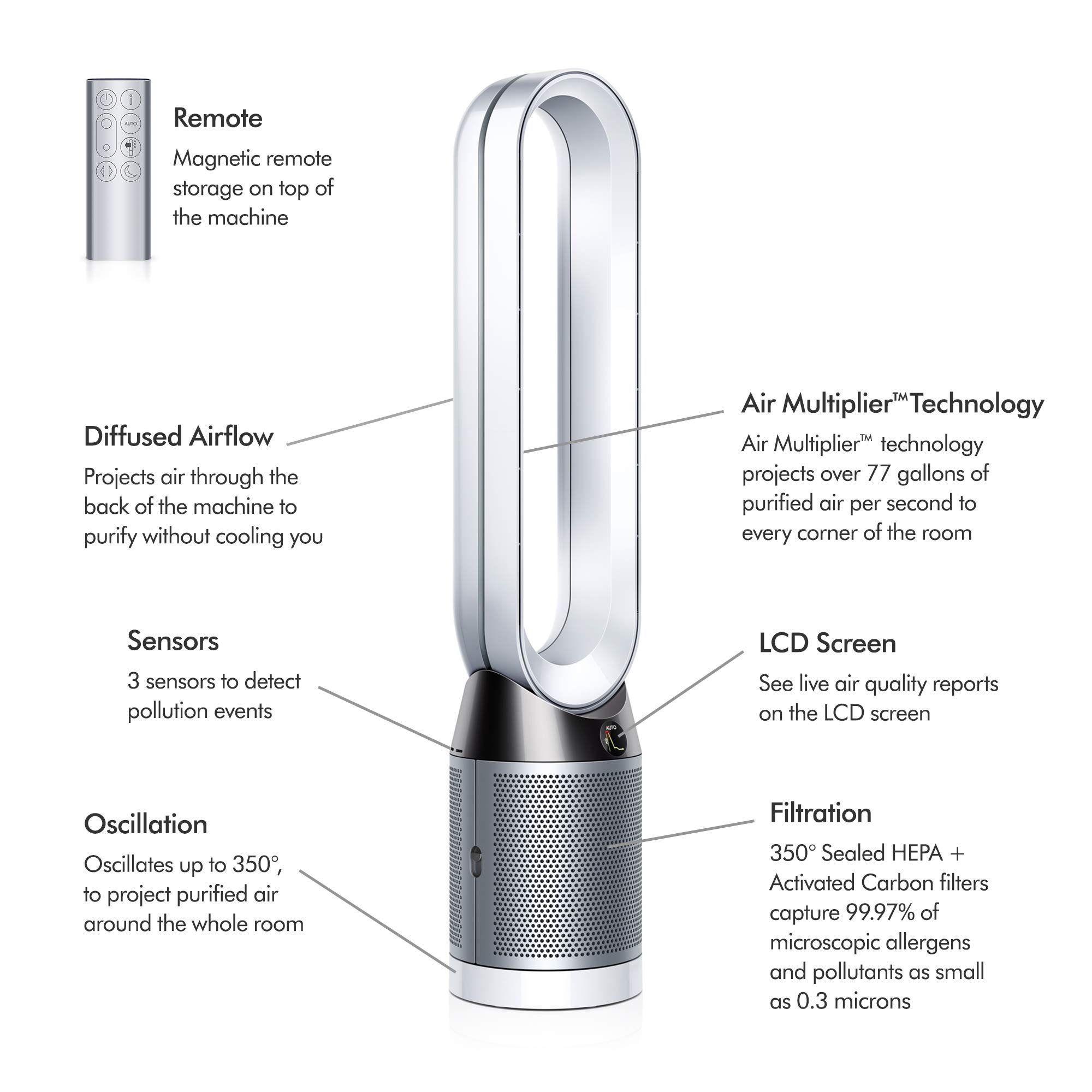 The Dyson Purifier Cool Air Purifier automatically senses, captures, and traps pollutants for cleaner air. Removes 99.97% of particles as small as 0.3 microns and uses Air Multiplier technology to generate the circulation power to purify your whole room.*