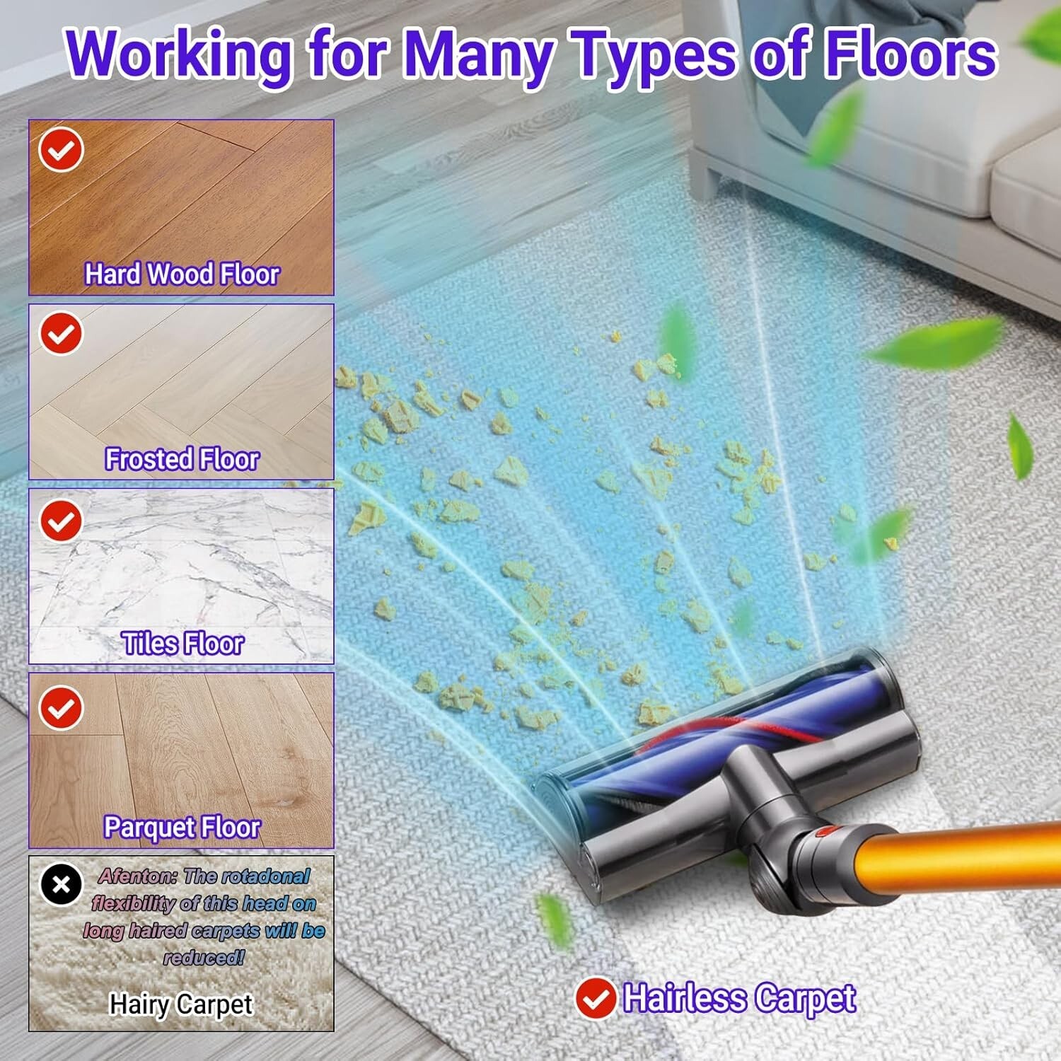 Upgrade V11 V8 Head for Dyson V11 V8 V7 V10 V15 and V11 Outside Cordless Vacuum Cleaner, Part No. 968266-02, 968266-04, 967483-01, 967483-03, 967483-04 for Dyson Head Product Compatibility: Upgrade Head for Dyson V11 V8 V7 V10 V15 SV10 SV11 SV12 SV14 SV15 SV22 SV25 SV27 SV28 SV37 and V11 Outside Direct Drive Cordless Vacuum Suction Head Attachments. Part No. 968266-02, 968266-04, 967483-01, 967483-03, 967483-04 for Dyson Head Zero-Tangle Design: Our upgraded direct drive suction brush head for V11 V8 V7 V10 V15 and V11 Outside head designs 43 hair removal blades and a tangle free comb, making it easy to remove dust, debris, and pet hair from hairless carpetswithout tangling. Attention: This head replacemnet for dyson is not good for hairy carpets!!! Flexible Rotation: This V11 V8 head can rotate 180° from left to right and 90° from front to back. Flexible rotation can make it easier to clean dust and debris under tables, sofas, and various furniture Easy to Install and Clean: Simply press the red release button quickly to separate the connector from the vacuum cleaner. The end cap of V7 head can be rotated with coins or flat hard objects, making it easy to clean, reuse, and maintain regularly Suitable for Most Types of Flooring: Our V11 head is very suitable for most types of flooring, including short haired carpets, wood, tiles, marble, and laminate. Attention: Not suitable for long haired carpets, as long haired carpets may be sucked into the brush head, affecting its performance
