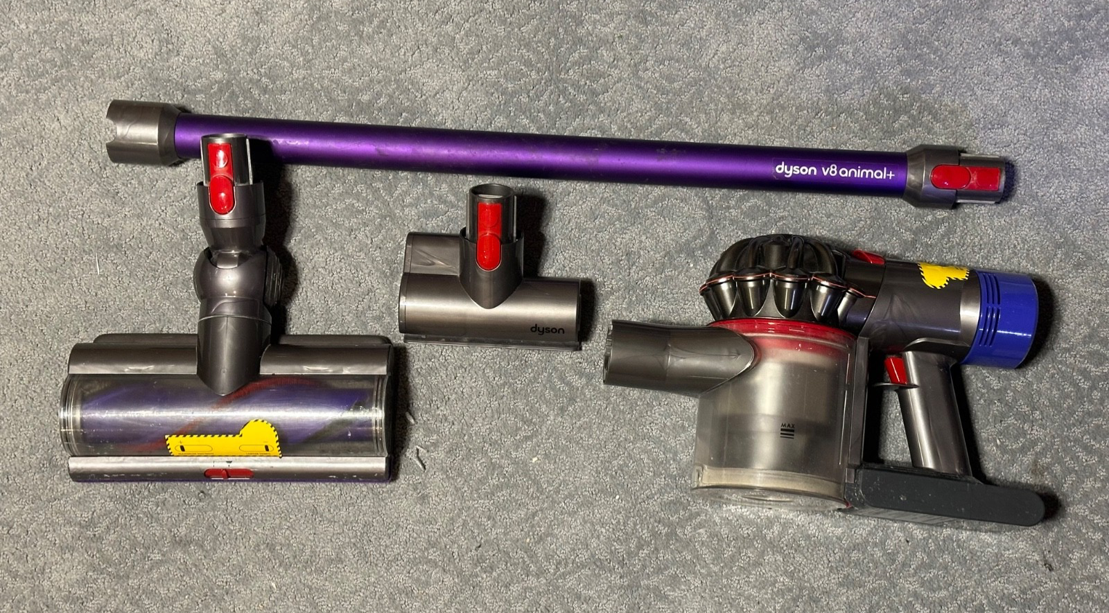 The Dyson V8 Animal Cordless Stick Vacuum Cleaner in purple is a powerful and versatile cleaner perfect for pet owners. With a runtime of up to 40 minutes and a charge time of only 3.5 hours, this bagless vacuum features HEPA filters for efficient cleaning. It includes a variety of accessories such as a crevice tool, brush attachment, and a docking station for convenient storage. The cordless design, height adjustment, and compact size make it easy to maneuver and reach tight spaces. This model is ideal for removing pet hair, cleaning carpets and hard floors, and maintaining a clean home with ease.