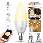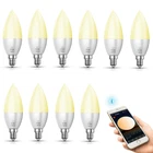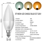 Product Description E12 E14 Bluetooth LED Smart Bulb Chandelier Candle Light 4W 110V 220V Spotlight E12 E14 Bluetooth Smart LED Chandelier Candle Light Bulb 4W 110V 220V 2835 SMD Energy Bulbs Important hint:(As show the Picture) 1.Scan to download Hao Deng free APP 2.Scan to read the detailed user guide Description : Increased range is desirable in any communication application, and it’s particularly important in home automation environments. Therefore, creating the Bluetooth Network system is the future of smart home technology. You can control your lights by the APP , it also has the TIMER , DIMMER function, built-in mode, music mode and other interesting small functions. Importantly, you can control up to 64 lights at the same time. Besides, adding the Smart Bridge to Control the Lights Anywhere. And you can achieve the function of remote control and voice control. If you want to get the function of remote control and voice control (Amazon Alexa, Google Home), you have to match smart bridge. If not match smart bridge, the bluetooth mesh devices can't support the voice control of amazon alexa and google home. Specification: Control principle: BLUETOOTH APP name: Hao Deng Channel:2 (warm white and cold white) Power:4W Luminous:320LM Irritation angle :120° Color temperature:2700K-6500K Number of lamp beads:WW:2835-1W*4, CW:2835-1W*4 Working temperature:-20 TO +45 ℃ Lamp Holder:110VAC-E12 ,220VAC-E14 Control Distance: No barrier, 30m Bulb Material:PC/Plastic plus Aluminum Working Voltage:110VAC/220VAC,50/60HZ Life hour:20000H Application:Indoor lighting, Bulb dimension:D:37.5mm H:110mm Package : 1 * Smart LED Bulb powered by