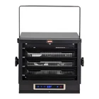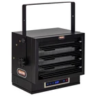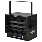 The Dual Heat 7500W Electric Garage Heater is the ideal heating solution for your garage, warehouse, or workshop. This unit includes multiple heat and timer settings as well as a 'fan only' setting, all easily controlled by remote control and displayed on the LED touch screen. The heater provides 17, 060 and 25, 589 BTUs while efficiently heating areas up 750 sq. ft. To ensure safety this heater was designed with overheat protection and a caution indicator light. 15 heat settings; Heats up to 750 sq. ft Dual Power Settings: 5000 watts, 21, 331 BTUs and 7500 Watts 25, 589 BTUs Use without heater for convenient summer fan only use Adjustable angles for horizontal and vertical air flow with safety lock Convenient Remote Control and LED Touch Screen Display and Control Hard Wire Installation Fully Enclosed Motor Sturdy, Rugged Construction Overheat Auto Shut-off Protection