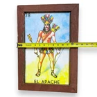El Apache Loteria Framed Print Rustic Distressed Wood Mexicana Design "Transform your space with the rustic charm and vibrant design of El Apache Loteria Framed Print. Crafted from high-quality wood, this Mexican-inspired artwork is a striking addition to any room. Captivate your guests with its unique character and bright colors. Perfect for anyone who loves bold, eccentric décor. The print is in good used condition and ready to hang. There is some wear on the frame and some paint stains. The print is also buckled in a few places.