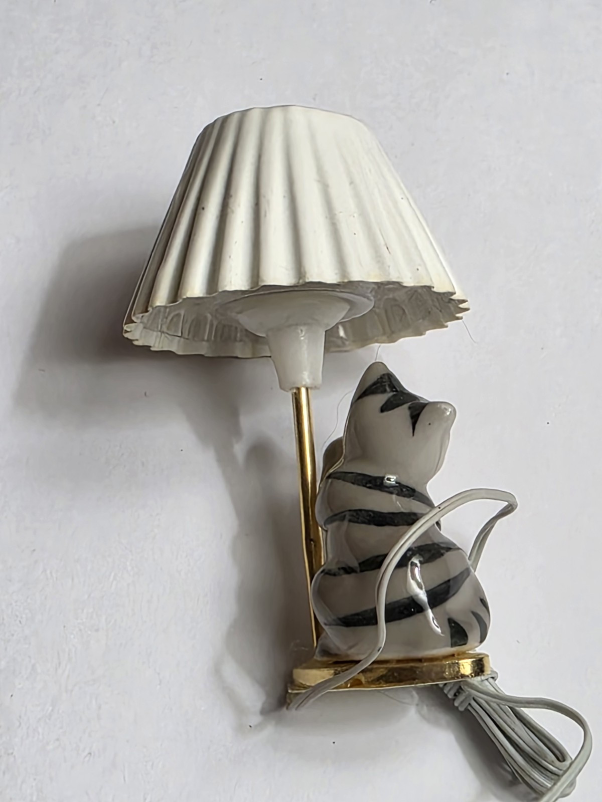 The dollhouse miniature is a vintage porcelain tabby cat kitten figurine lamp that has been electrified. This unique piece serves as both a decorative figurine and a functional lamp for dollhouses or miniature displays. The detailed design of the tabby cat adds a charming touch to any dollhouse setting, making it a delightful addition for collectors or enthusiasts of dollhouse miniatures. Great condition