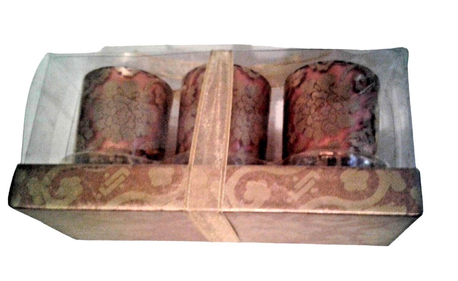 This Unbranded Candles Brown Gold Flowers Roses Votive set adds a sophisticated touch to any space. Each 2 1/2" tall, 2" top candle has a sparkling top and comes in a gift box set of 3. • Unbranded votive candle set • Brown Gold color with flower design • 2 1/2" tall, 2" top candles • Sparkle top detail • Set of 3, includes gift box