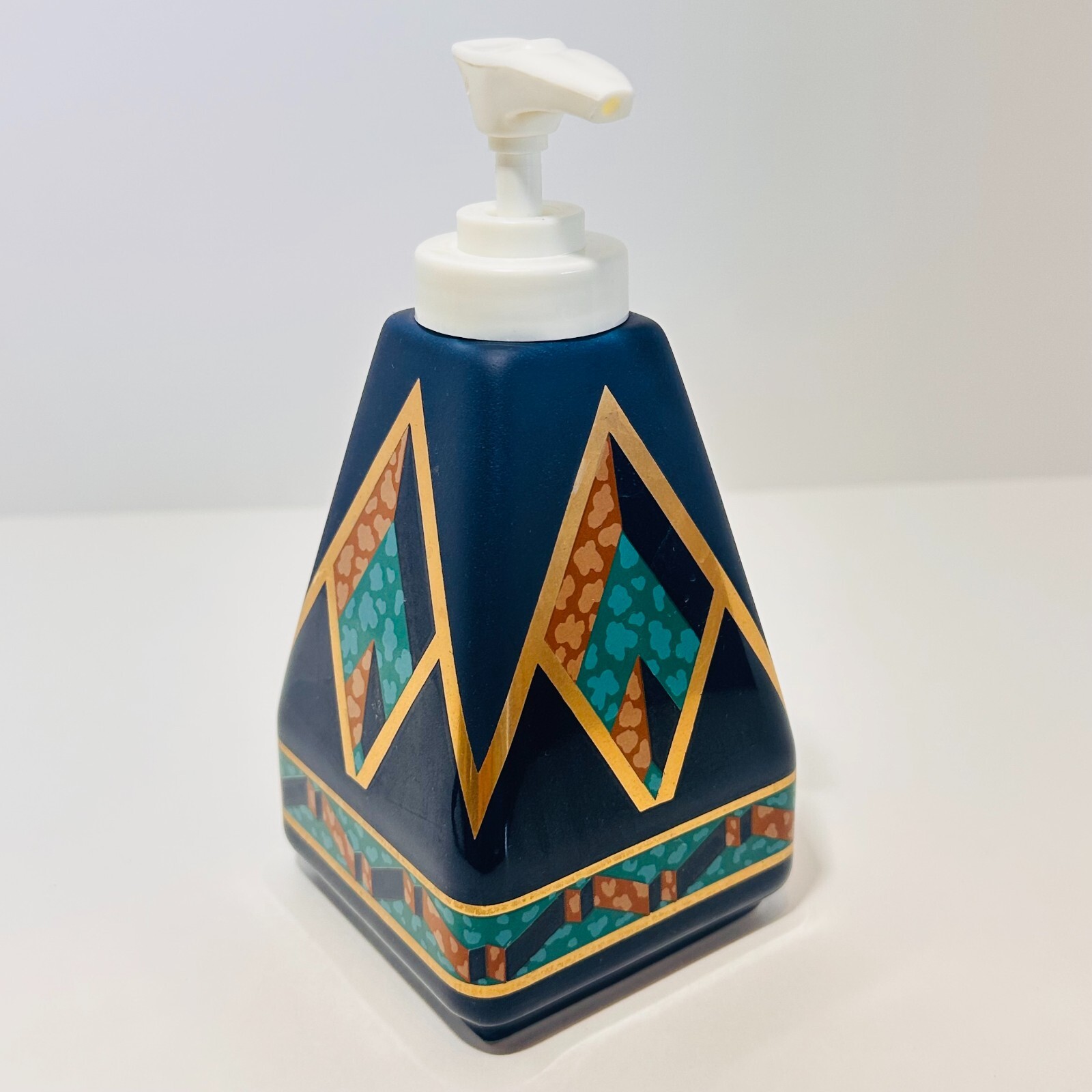 Elevate your bathroom or kitchen decor with the Delta Navy & Gold Soap/Lotion Dispenser. This elegant piece, featuring a timeless geometrical design, combines functionality with a touch of sophistication. Crafted from high-quality ceramic, it is designed to complement any contemporary space with its navy and gold color scheme.The dispenser is a free-standing model, making it easy to place anywhere for convenient access to your favorite soap or lotion. It's an ideal addition to any adult space that values both style and practicality. Keep your hands clean and your space stylish with this chic and practical accessory. *Main photo is a staging photo. Only item listed is being sold.