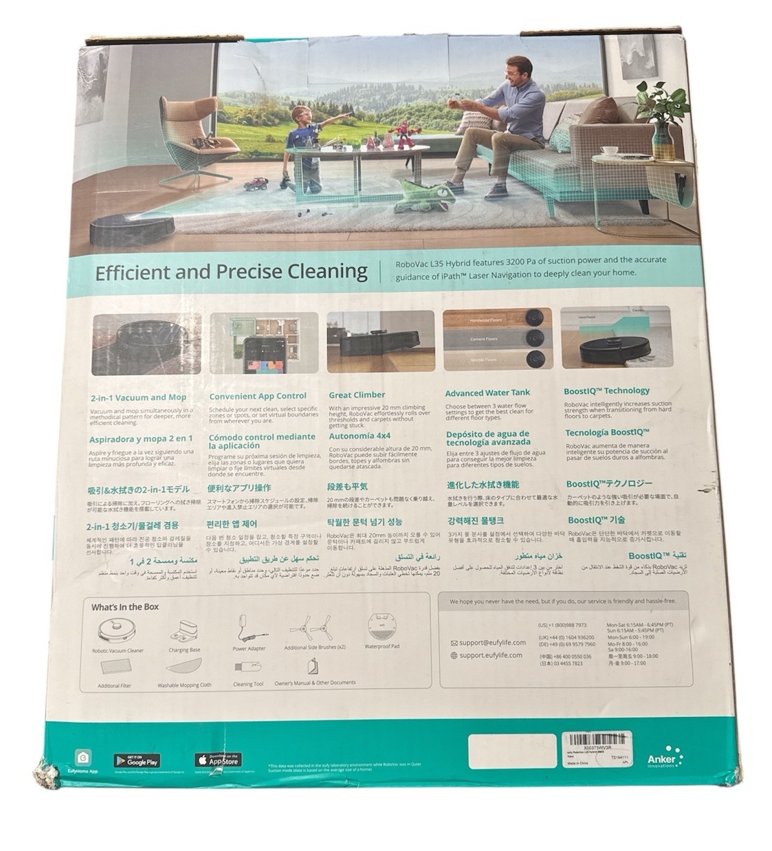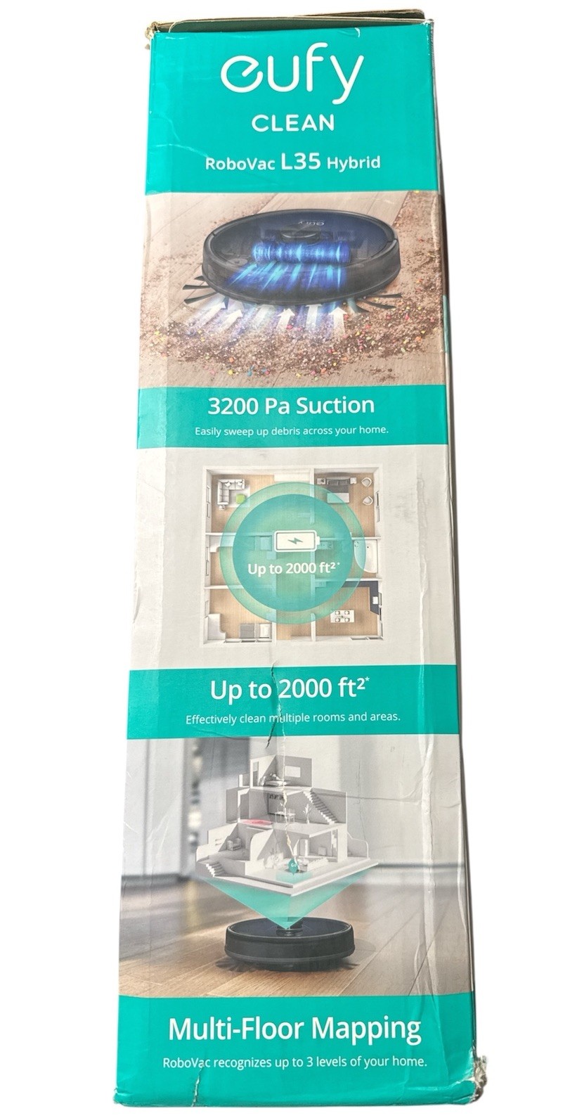 The eufy RoboVac L35 Hybrid is a black robotic vacuum and mop with 3200 Pa of ultra suction power. It is bagless and compatible with Amazon Alexa for smart home integration. With a runtime of up to 145 minutes and a compact design, this robot vacuum is perfect for multi-floor homes with features like no-go zones, virtual boundaries, and UV-C lamp for enhanced cleaning. Made by Eufy and manufactured in China, this cordless vacuum includes a disk filter and takes only 3.5 hours to charge. It comes with a 2-year manufacturer warranty and weighs 8.6 pounds.