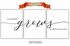 This listing is for three posters which say " Everybody Grows At Different Rates " This would look great in your home or a friend’s home! This would also make a great gift! This listing is for unique UNFRAMED prints in the size of your choosing. This is the perfect gift or home decor poster print for the bedroom, over the bed, classroom, or a house warming gift. I use only the highest quality canon and HP heavyweight paper with a smooth finish. Made in the USA personally by me assuring quality. Please note this Item does NOT come framed. Thank you for stopping by my shop. ░▒▒▓ About this Listing: ▓▒▒░ - 3 High quality posters printed on Acid free high quality paper. Resolution: 300 dpi for the best quality printing. Size: 5x7", 8x10”, 11x14", 12x16" or 18x24 (Send us a message for larger and other custom sizes) All sizes are standard and easily framed. ╱╱╱╱╱╱╱╱TERMS OF USE ╱╱╱╱╱╱╱╱ - For Personal Use Only. - Colors on monitors may vary. - Frame is not included. Thanks for Visiting. Please check out our other items!