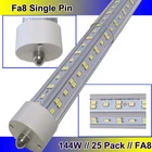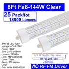 FAST DELIVERY - Ship from New Jersey or Los Angeles Warehouse via FedEx , 3-7 Days Delivered Your Door . SCIENTIFIC DESIGN - 8Ft LED Shop Lights Fixture is Made of 6500K Cold White SMD2835 LED Chip ,Plastic Clear Cover , Aluminum Bracket Housing ,and AC85-277V Constant Current Driver . It can work in -68F to 120F Temperature Conditions EASY INSTALLATION - The Integrated Tube Fixture Can be Install on Wall or Ceiling ,Easily Replace Traditional Fluorescent Tube Bulb . Plug and Play , Free Accessories (Power Cords, Connector , Extension Cords , Clip and Screw ) Come with Tube Lights Together WIDE APPLICATION - Linkable 8Ft Bulbs Widely Used in Garage Ceiling , Barbershop , Schools, Hospitals Basement , Factory Warehouses , Supermarkets Cooler Door , Offices, Shops,Hotels, etc FA8 T8 8FT LED Shop Lights Single Pin 144W LED Tube Light Bulbs 6500K 25PACK 【No RF & FM Interference】LED Driver have passed Electromagnetic Magnetic Compatibility EMC tests,No cause EMI ,No longer subject to any RF & FM jamming. Never interfering with the signal of your garage roller shutter door,No make noise when you listen radio 【Easy to Install】Just simply bypass the ballast and connection AC85-277V AC power . Not compatible with single-ended powered sockets 【Wide Application】 - 8Ft 144W V Shaped FA8 HO LED Bulb fitted to replace traditional F96T12 T8 T10 T12 fluorescent bulbs. Widely used in Garage,supermarkets, offices , convenience stores , gas stations , warehouse,parking lot,shops, hotels,Refrigerator,coolers or freezers illumination,etc 【High Output】8Ft 144W 18000LM FA8 【Rotate Cap & Swivel End】 Easy Adjust rotated Lighting Direction within 180 degree after Installation
