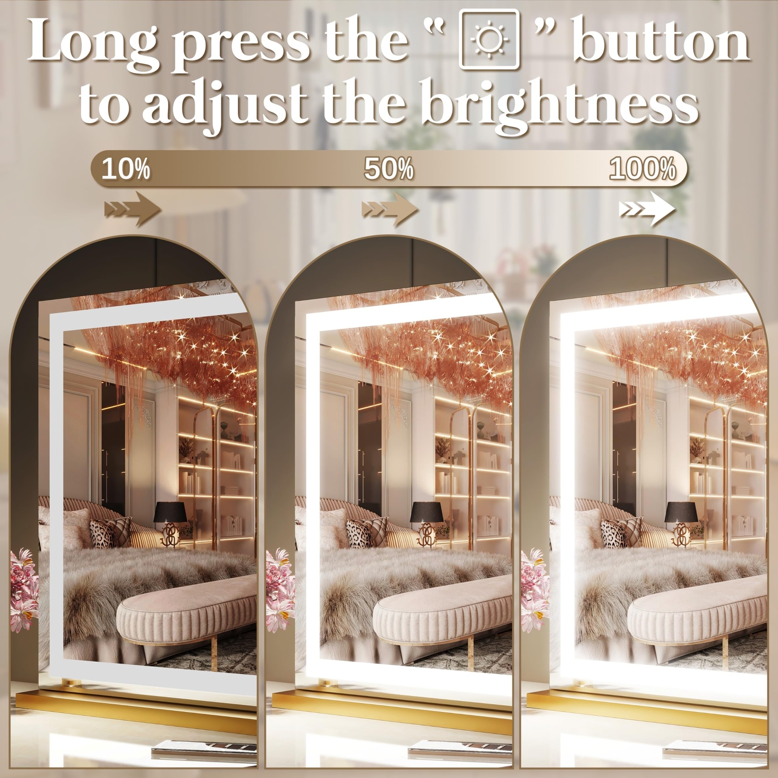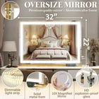 FENNIO Vanity Mirror with Lights 32"x22", Lighted Makeup Mirror, Large Vanity Mirror, Touch Sensor with 3-Color Lighting, 10X Magnification and USB Charging Port for Vanity Desk(Square Gold) Product Details Brand: FENNIO Room Type: Bedroom Shape: Rectangular Product Dimensions: 22.5"L x 31.5"W Frame Material: Aluminum Brand: FENNIO Room Type: Bedroom Shape: Rectangular Product Dimensions: 22.5"L x 31.5"W Frame Material: Aluminum Style: Modern Mounting Type: Dresser Mount Finish Type: Polished Surface Recommendation: Glass Special Feature: Corded Color: Gold Number of Pieces: 1 Number of Items: 1 Material: Aluminum Frame Type: Framed Assembly Required: No Manufacturer: FENNIO Size: 22.5"L x 31.5"W Item Weight: 18.71 pounds Date First Available: August 12, 2024 Adjustable Brightness & 3-Color Lighting ModesLong press the button to adjust the brightness ranging from 10% to 100%; Choose from cool, warm, or natural lighting modes to suit your preference and create the perfect atmosphere for any occasion. Enhanced Large Size & Minimalistic Rounded Design The Vanity mirror with 32"W X 22"H provides a perfect upper body view. Features 10X magnification makeup mirror is perfect for tweezing & grooming with accuracy Smart Touch Sensor Smart touch buttons for this light-up vanity mirror Simply short press power ON/OFF & change the light color, and Long press to adjust the brightness. We keep all the Functions the one touch, it can serve you great. Sturdy Aluminum FrameConstructed with a sturdy aluminum frame and high-quality glass, our vanity mirror is designed to withstand daily use and provide years of reliable performance. Quality guaranteed and longer Lifespan, more than 50,000 hours lifetimes Perfect Gift for AnniversaryOur vanity mirror with lights makes a thoughtful and practical gift for a versatile and stylish addition for any great moments such as Valentine's Day, Mother's day anniversary, etc. for your girl, girlfriend, wife, or friend to upgrade their personal care routine