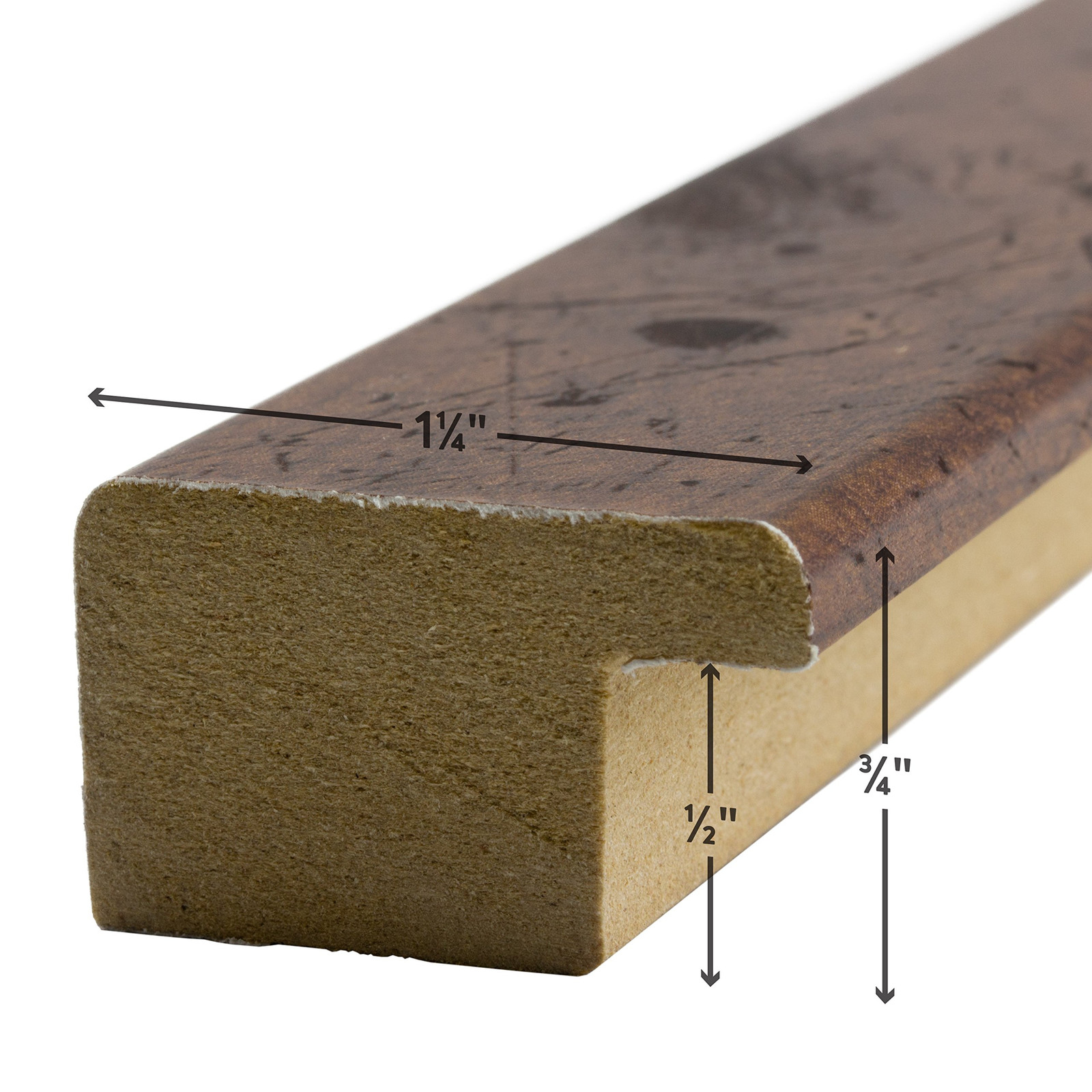 Traditional style; dark walnut brown; distressed wood grain appearance; smooth wrap finish Frame includes: glass, rigid black backing and pre-attached stamped hanging hardware Frame holds a 8.5 inch by 11 inch photo/print (viewable area is slightly smaller) Frame moulding is 1.26 inches wide; wood composite material Made in the U.S.A.