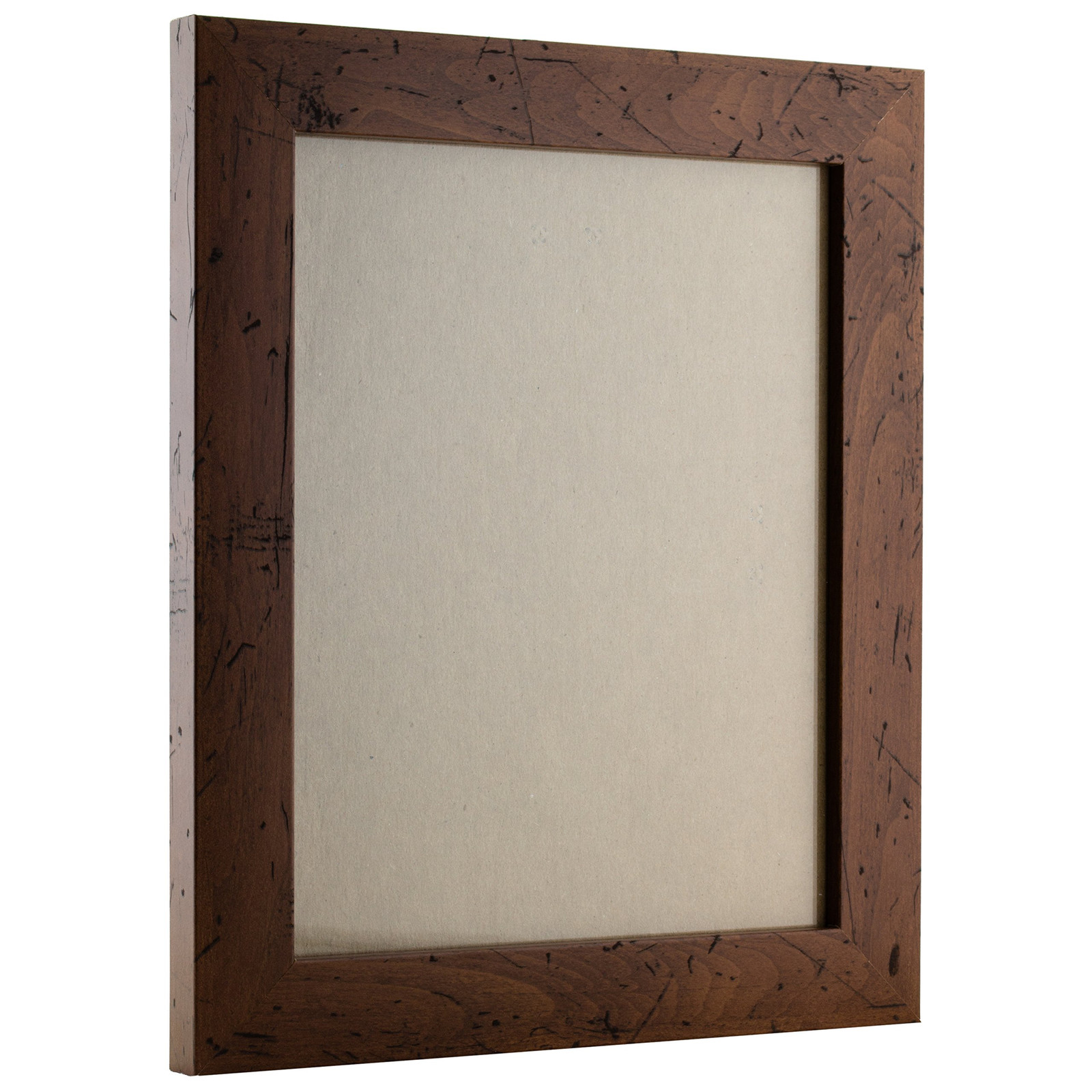 Traditional style; dark walnut brown; distressed wood grain appearance; smooth wrap finish Frame includes: glass, rigid black backing and pre-attached stamped hanging hardware Frame holds a 8.5 inch by 11 inch photo/print (viewable area is slightly smaller) Frame moulding is 1.26 inches wide; wood composite material Made in the U.S.A.