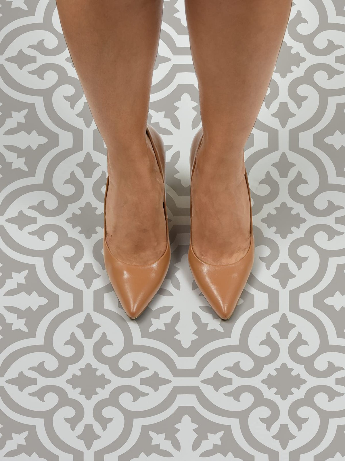 Grey and white peel and stick floor tile with a farmhouse style Peel and stick to apply Easy installation - no grout or special tools needed Water resistant and washable Virgin Vinyl material with a textured low lustre finish and permanent adhesive makes tiles durable One package contains 10 tiles that each measure .06-in in depth Each tile measures 12 x 12 inches