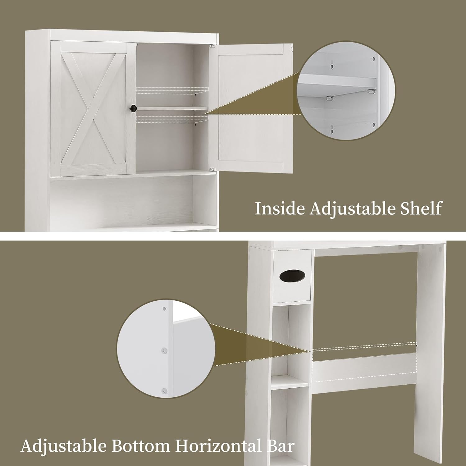 Product Description Over The Toilet Storage Cabinet, Farmhouse Storage Cabinet with 2 Barn Door Freestanding Space-Saving Bathroom Organizer with Adjustable Shelves & Toilet Paper Holder, for Bathroom, Restroom, Laundry About this item Rustic Double Barn Door Style – Classic farmhouse design with two barn doors adds warmth and character to any bathroom decor. Built-In Toilet Paper Holder – Convenient side-mounted toilet paper holder keeps essentials within easy reach and saves even more space. Space-Saving Over Toilet Cabinet – Turns unused wall space into practical storage for toiletries, extra rolls, and cleaning supplies. Strong & Stable Structure – Crafted from thick engineered wood for long-lasting durability, and designed to stay stable over your toilet. Fits Most Standard Toilets – Designed to fit above most toilets, perfect for apartments, homes, dorms, or small bathrooms.