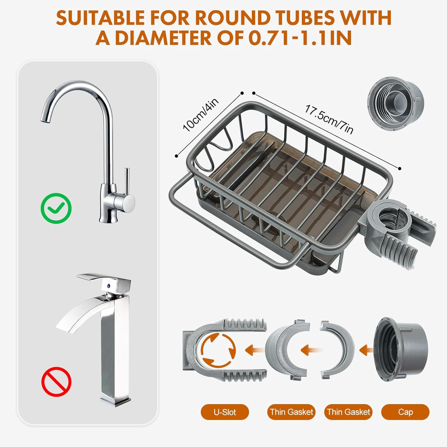 Faucet Sponge Holder, Holder for Kitchen Sink,Bathroom gunmetal gray Product Details Specific Uses For Product: Sinks, Showers Material: Aluminum Special Feature: Automatic Drainage, Adjustable Color: gunmetal gray Brand: SMNVL Finish Type: Polished Product Dimensions: 6.7"D x 3.9"W x 2.4"H Number of Items: 1 Manufacturer: hunanmeiqixinxikejiyouxiangongsi Part Number: Drain Sponge Holder for Kitchen Item Weight: 11.4 ounces Item model number: Sponge Holder Finish: Polished Special Features: Automatic Drainage, Adjustable Batteries Included?: No Batteries Required?: No Specific Uses For Product: Sinks, Showers Material: Aluminum Special Feature: Automatic Drainage, Adjustable Color: gunmetal gray Brand: SMNVL Finish Type: Polished Product Dimensions: 6.7"D x 3.9"W x 2.4"H Number of Items: 1 Manufacturer: hunanmeiqixinxikejiyouxiangongsi Mounting TypeItem Weight: Faucet Mounting0.33 Kilograms SPACE SAVING DESIGN.The faucet sponge holder is a perfect storage gadget for kitchen or bathroom, which can hangs over the round tube faucet to help hold small items such as brushes, sponges, soap,detergent ect. With an additional hook, the sponge holder can also hang dish towel or peeler to save your space.With our sink sponge holder, you will be surprised that your sink is no longer cluttered. EASY TO INSTALL.Our sponge holder for sink is easy to install, requires no drilling or glue,no worries for any damage or marks on your sink. Simply attach it up to the round tube and tighten the cap,the sponges holder for kitchen sink will be fixed stably.You can freely adjust its height and direction. Our sponge holders is equipped with thin gasket and thick gasket, suiting for round tube for diameter of 0.71-1.1 inches. DURABLE MATERIAL.Our sponge holder sink is made of Premium Aluminum, which is waterproof, rust-proof, and durable for loading. The updated material allows you to avoid the trouble of deformation and rust with ordinary products. Each set of kitchen sink caddy sponge holder comes with a set of additional parts to prevent installation accidents in advance. KEEP COUNTERTOP DRY. The sink organizer sponge holder adopts a strip-shaped hollow bottom,which can speed up the draining. With a removable drip tray at the bottom of the sink holder for sponge, it helps to avoide water wetting the countertop and keep the kitchen countertop dry and clean. PURCHASE NOTES. Our sponge holders for kitchen sink is suitable for round tube for diameter of 0.71-1.1 inches. Note that non-circular water pipes cannot be installed.