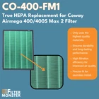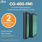 Model Compatibility: Filter-Monster True HEPA Replacement with Carbon Filter Set compatible with Coway 400/400S Airmega Max 2 filter. Engineered to fit Coway Airmega 400 and 400S air purifiers. Activated Carbon: The Filter-Monster HEPA Replacement Air Filter has integrated carbon that reduces household odors and VOCs (volatile organic compounds) from cooking, cleaning chemicals, and smoke. True HEPA filtration: HEPA filter replacement captures up to 99.97 percent of particles as small as 0.3 microns including smoke, dust, pollen, pet hair and dander, mold spores, and dust mites. Improve the air quality in your home all year round. Replacement Time: Depending on air quality environment and usage, it is recommended to replace the HEPA filter every 12 months to help ensure the Coway Airmega air purifier is running efficiently. Dimensions: Filter-Monster True HEPA Replacement with Carbon Filter Set compatible with Coway 400/400S Airmega Max 2 filter. The air filters approximate dimensions are: 14.37" x 11.02" x 1.77”. Included in the package are two (2) replacement filters.