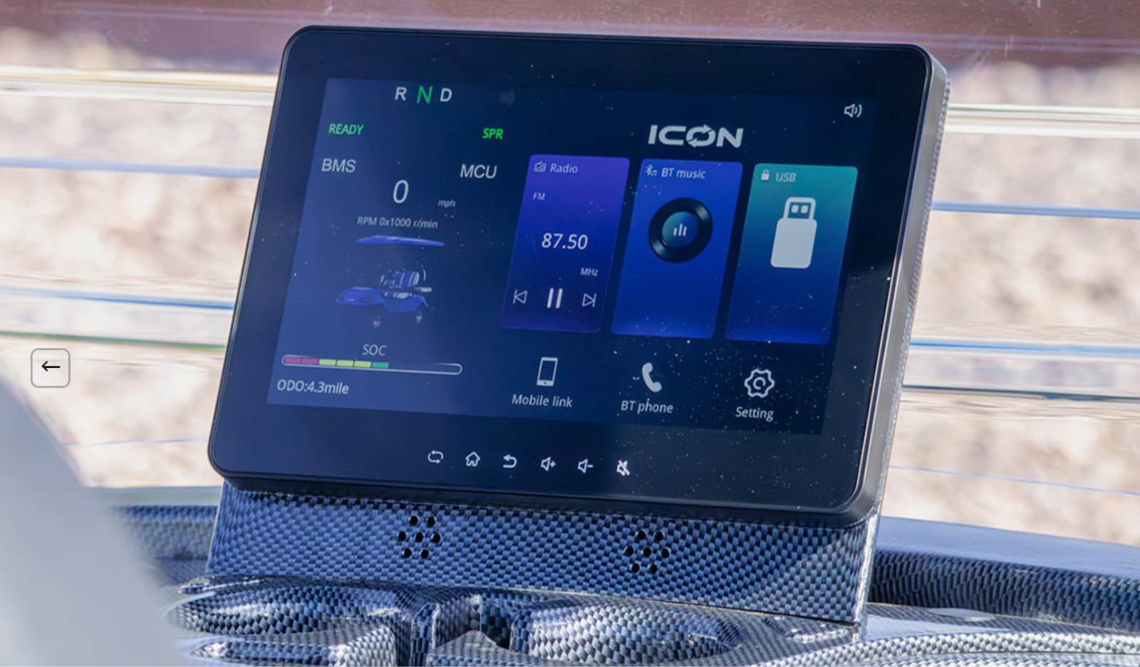 10.1” Digital Display Multimedia Touch Screen with IP67 Rating, Bluetooth, Phone, Radio, Music Specifications - Fits ICON Golf Cart Models: i20, i20U, i20L, i40, i40F, i40L, i60, i60F, i60L, i80 with Lithium Battery packs .