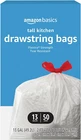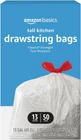 Tall kitchen trash bags in Unscented (50-count), each with a 13 gallon capacity Tear-resistant white plastic material with reliable Flextra strength. Flextra technology embosses the trash bag with a flex pattern, to better control the stretch of the bag to assist in minimizing tears and punctures Red drawstring closure for easy tying and carrying Alexa voice shopping enabled: to place your next order, just say, “Alexa, reorder Amazon Basics Tall Kitchen Drawstring Bags" Product Description Amazon Basics Flextra Tall Kitchen Drawstring Trash Bags, White trash bag with red drawstring closure for easy tying and carrying Flex-tra strength From the Manufacturer Amazon Basics