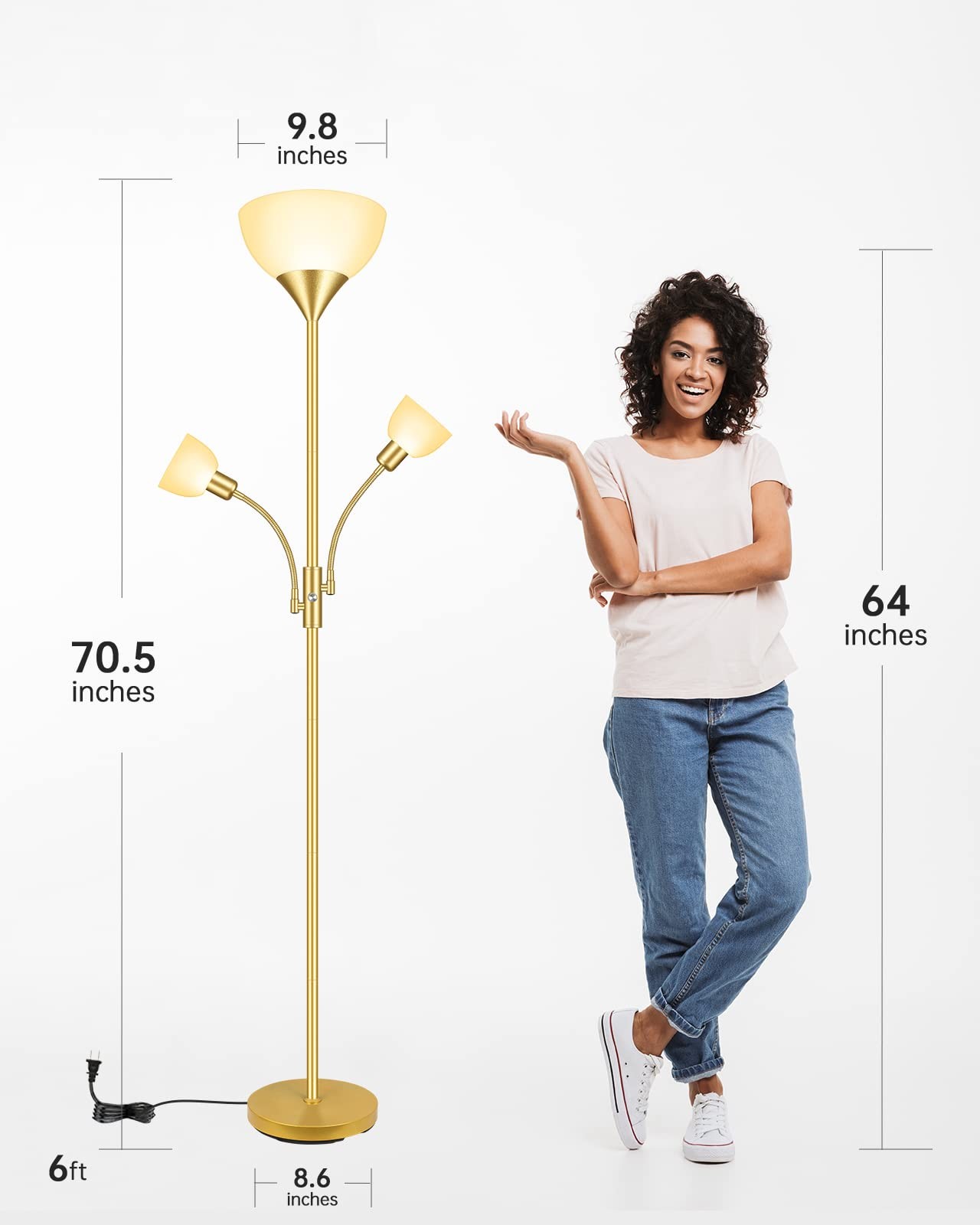 If you are looking for a reading tree floor lamp to make your house more attractive, then our farmhouse floor lamp is your ideal choice! With the beige hanging beautiful decorative lampshade compatibel with all kinds of room decor like modern, farmhouse, rustic, vintage, boho, traditional, urban, retro, classic, Mid Century etc.. It greatly provide enough brightness to illuminate your house. Specification: 1. Farmhouse Floor lamps for living room with built in E12-Socket base and 5W LED Bulbs 2. Modern tree lamps with measures 3. 3-Light Standing lamp for bedroom Beige 4. 3-Head Rustic Farmhouse floor lamp with toggle switch 5. Boho Stand up light metal 6. Mid century stand up lamp with 6-foot cord Features: - Modern floor lamp features 3 decorative lampshade - Minimalist Stand up lamp - Fits in your living room, bedroom, den, office, classroom - Farmhouse Floor lamps for living room - match with modern and traditional home decor - standing Lamp with tall pole design for reading - Farmhouse floor lamp with the sturdy base - Modern floor lamp with E12 base - Black Tall floor lamp with toggle switch - American Standard Plug - Assembly is required Where can I put an modern floor lamp in my home? Commonly, standing lamps are found in living and family rooms where people often gather. You can add a cozy glow to the space that will help set the mood to unwind with your family and any guests you are hosting. However, standing lamp also add a great touch to bedrooms and offices as well. š”Create Your Own Style You can customize this stylish floor lamp standing lamp with different shapes of any E12 light bulbs to create your own style. š”Easy Assembly And Move Only need to connect the tubes one by one and you can easily move to the place you need. šćE26 Base Floor LampćThe torchiere floor lamp designed with E26 base, it can used universal bulb, like LED, halogen or incandescent bulbs. The standing lamp with plastic lampshade keep a cool touch even after hours of use, so no worries about the overheating issue. Note: Bulb not included. šćGooseneck Tree Floor Lampćfloor lamp with reading lights attached comes with Main Lamp and 2 reading Lamps, the adjustable small lamp allows you to adjust angles to illuminate your projects, like reading, working or daily use; Emitting warm white light, the Eye-caring floor lamp led daylight will not harm your eyes; Also, with the three options of the rotary switch, you can choose the Main Lamp On, Side Lamp On, or Both Lamp On according to different task needs šćSafe and Easy AssemblyćWe take safety seriously into consideration, with a stable base and metal pole, this lamp for bedroom tall provides good stability from falling, which is safe for your baby and pet; it can also be easily placed in the bedroom, living room, and other places according to your wishes; Simple and easy to assemble within 5 mins without extra tools, you just need to screw all the parts of the LED floor light working together by following the instruction video on the page šćElegant DecorćThanks for the tight but sturdy base design, the office standing lamp can straight stand easily in any corner, slide it behind a couch or place it beside nightstand, and you can move it easily into various places in the living area; Besides, its slim design makes it not only tall floor lamps for bedrooms, lamps for office or classroom, but also a modern decoration to girls or boys room; The standing floor lamp fits well with coastal, mid-century modern, casual, or contemporary šćCompatible with smart devicesćYou can plug the standing lamps for living room in the smart plug (not included), or connect it to a wall switch (not included); Add the tall floor lamp to your home appliances group, and easily controlled this torchiere floor lamp by your phone; Intelligent design of room floor lamps for bedroom help you enjoy easier life and home automation