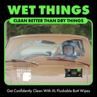Goodbye toilet paper, hello flushable wipes Send toilet paper back to the Stone Age, where it belongs! As seen on Instagram, the new flushable wipes are saturated with witch hazel and geranium essential oils, so you don’t have to worry about the aftereffects of eating those spicy wings. Made with 99% water and plant-based ingredients, our wipes are gentle on your skin and fresher than toilet paper. So tell your friends: you officially have the freshest butt in the game. When it comes to flushable wipes, size matters. And good thing we’re big. We’re 35% bigger than the rest (because no one wants to wipe a tiny bit after a giant burrito). Made with plant-based fibers, our flushable wipes help protect the planet and our pipes, and are free of fragrance, parabens, phthalates, and a bunch of other hard-to-spell words. Unlike baby wipes, the wipes begin to break down after you flush them, so they’re safe for drains and septic tanks. Plus, each of our 144 plush wipes comes in a sleek dispenser with a flip-top lid that fits perfectly on your toilet. So just sit back, relax, and take in the sweet scent of these herbs. These wipes smell great, feel great, and leave you super clean. So much better than dry toilet paper. 144 Flushable Wipes for Adults Total Herbs infused with witch hazel and geranium essential oils for soothing benefits Free of fragrance, parabens, phthalates, and other hard-to-spell words Made with 99% water and plant-based ingredients Sewer safe and septic tank safe 35% larger than regular flushable wipes The wipes now wipe over 1.5 billion cigarette butts every year! Gentle on skin, designed to feel cleaner and fresher than toilet paper The wipes come in a stylish, convenient dispenser