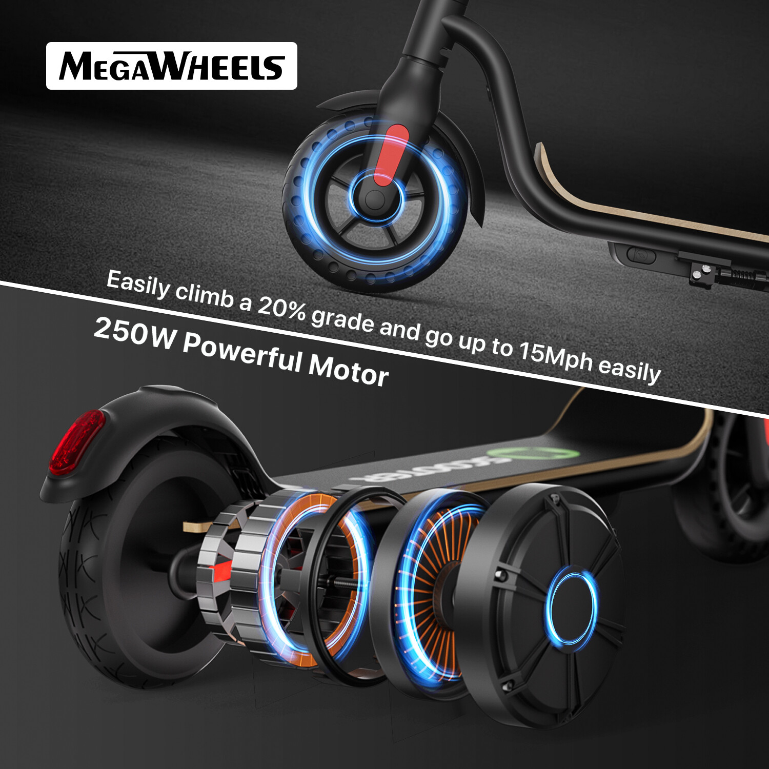 Main features: LONG RANGE BATTERY LIFE - Powerful 250W motor and 5.2 Ah/36V lithium battery pack that supports a speed of up to 15 Mph with a range up to 7 Miles. Updated large-capacity battery life, designed for commuters and longer distances. 8.0" HONEYCOMB & SOLID TIRES - Shock-absorbing rubber tires offer a smooth ride even over bumpy surfaces. PORTABLE FOLDING DESIGN - Electric scooter can be folded easily in 3 seconds with quick folding latch for easy carrying and storage. BATTERY INDICATOR AND LIGHTS - Battery indicator keeps to track battery life. Ultra bright LED headlight and taillight. Fast recharging about 4 hours. GEAR SHIFT SETTING - 1st gear for a 7 Mph comfortable ride or 3rd gear to get the 15 Mph fast experience. Extremely fun to ride and end boring commutes. Specification: Brand: Megawheels Model: S10 Dimension: Unfolding 105 x 43 x 118 cm; Folding: 105 x 43 x 48 cm Net Weight: 11.9kg Color: Black Frame Material: Aluminium Tires: 8.0" Honeycomb Front Tire & Solid Rear Tire Max Load: 100kg Max speed: 25KM/h Speed level: Gear 1--Max 10km/h ; Gear 2--Max 20km/h; Gear 3--Max 25km/h Mileage: 8-12km Grade Ability: 20 degree slope Working Temperature: -15°C-50°C Storage Temperature: -20°C-25°C Mode Type of Motor: Brushless hub motor Battery Type: High quality lithium battery Battery Capacitiy: 5.2 Ah Battery Voltage: 36V Charger Input Voltage: 100V-240V Charger Frequent: 50Hz/60Hz Charging time: 4 hours Package Contents: 1 * Folding Electric Scooter 1 * Battery Charger 1 * User's Manual NOTE:The appearance of the product you receive may vary slightly from the image shown due to differing production batches! Riding Skills: -Put your foot in the front of the scooter and the other foot on the floor before riding. -Make sure that the riding route is smooth. -Slide forward with the food standing on the floor before starting (like riding the scooter without power). -Immediately press the acceleration button and lean forward to avoid falling over backward due to inertia, so that the electric scooter will enter the working status. -Avoid pressing the handle with your body in the acceleration and deceleration process. Put one foot ahead and the other behind (like on the sliding plate/surfboard, put one foot ahead and the other behind by 70-90 for better comfort). -Turning – The turning principle of the electric scooter is the same with that of surfboard/sliding plate/skis. The handle shall be balanced with the body. Observe and make sure that turning is safe before turning. Tips: Before riding the scooter, please put one foot on the scooter deck and the other foot on floor and push the scooter forward by kicking the floor for some distance, in this way, the scooter will get some impulse to run forward. Note: This products have been certified under UL2272 safety standards. On Feb 27, 2025 at 11:04:38 PST, seller added the following information: