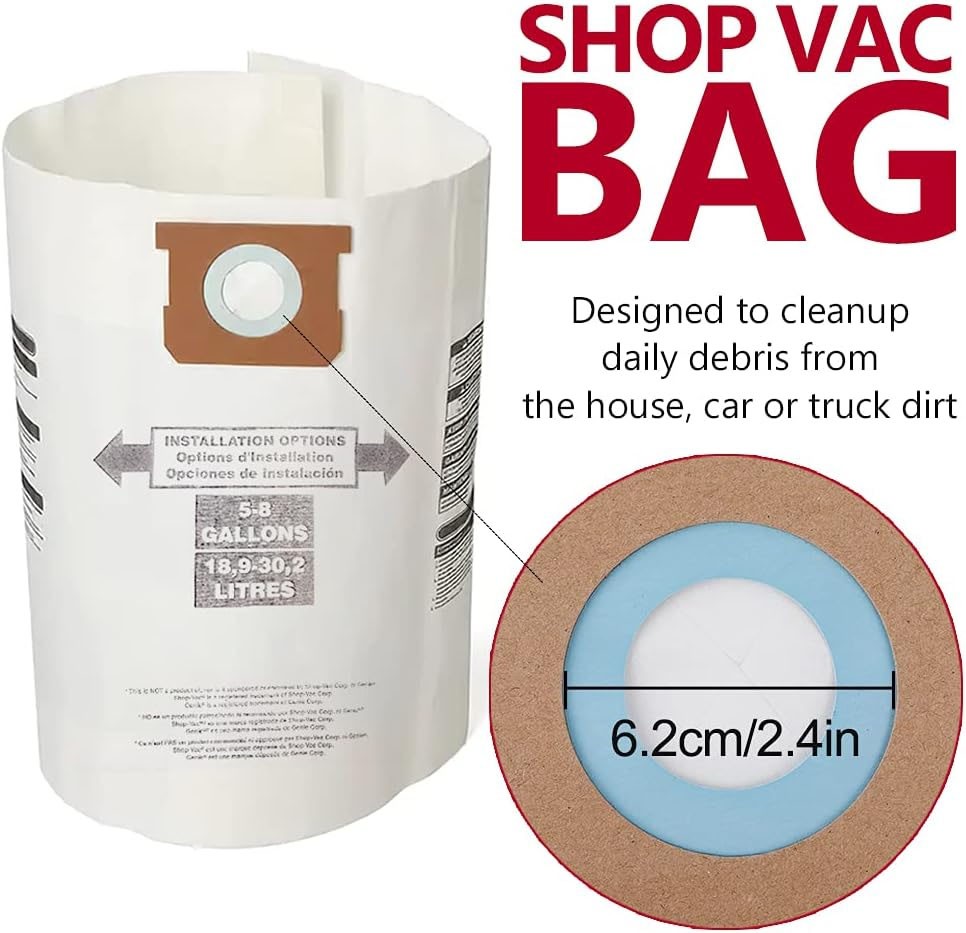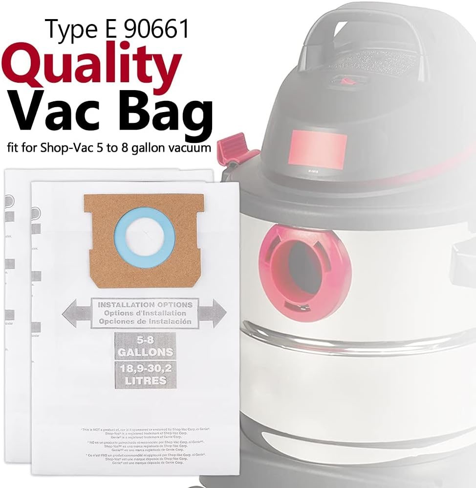 90661 Type E Replacement Shop Vacuum Bags COMPATIBILITY: The 90661 dust collector bags compatible with Shop-vac 5-8 gallon vacuum 84L250B, 84L300, 84M250B, 85L350, 85M300, 86L350, 86M300, 87L350, 87L450, 87M300, 87M350, 90M300, 92L350, 92M300, H87S550A, H87S650C, QL20ATS, QL20ATSP, QPL40, QPL650, 12RT300, 4045, 6045AH, also compatible with porter cable PX18406-5B, for dry debris pick-up only EFFICIENT DUST CAPTURING: The replacement vacuum bags hold most of particles and dust from workshop or house. Effectively collector drywall dust, cement dust, sawdust, house debris, lint, wood dust, construction debris and dust PACKAGE: Include 3/5/6/8/10/12/15 Pack 90661 shop vac bags TIPS: 24 hour online. If you have any question, please feel free to reach us On Nov 13, 2025 at 19:47:16 PST, seller added the following information: