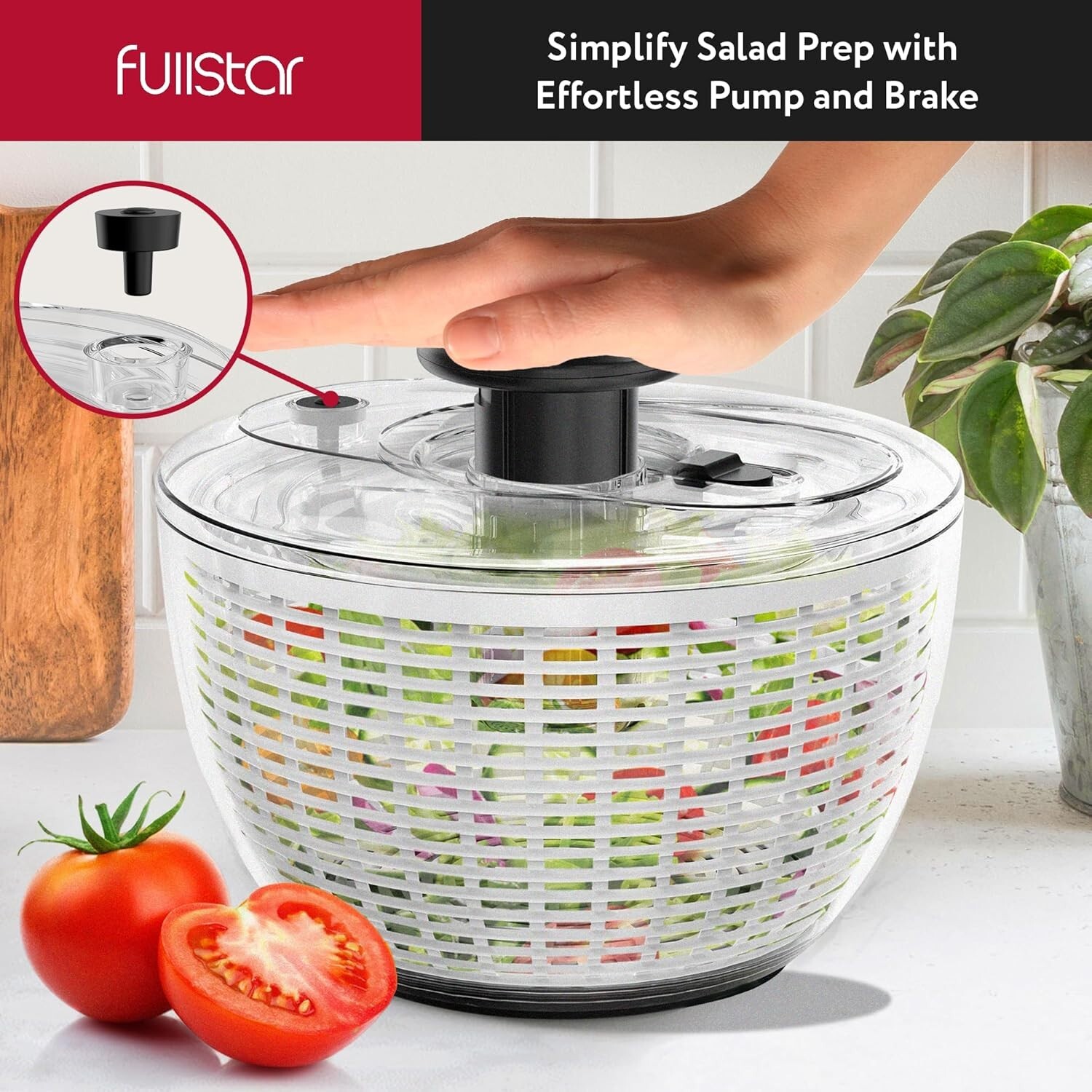 Simplify meal prep with the Fullstar Large Salad Spinner, a versatile 6.3-quart tool for washing and drying lettuce, fruits, and vegetables. This durable and efficient spinner quickly removes excess water, ensuring crisp salads and clean produce every time. Perfect for large portions, it features a user-friendly design with a secure lid and smooth spinning mechanism. Ideal for everyday kitchen use, the Fullstar Salad Spinner makes washing and drying your greens and produce faster and easier. A must-have for healthy, fresh meals!