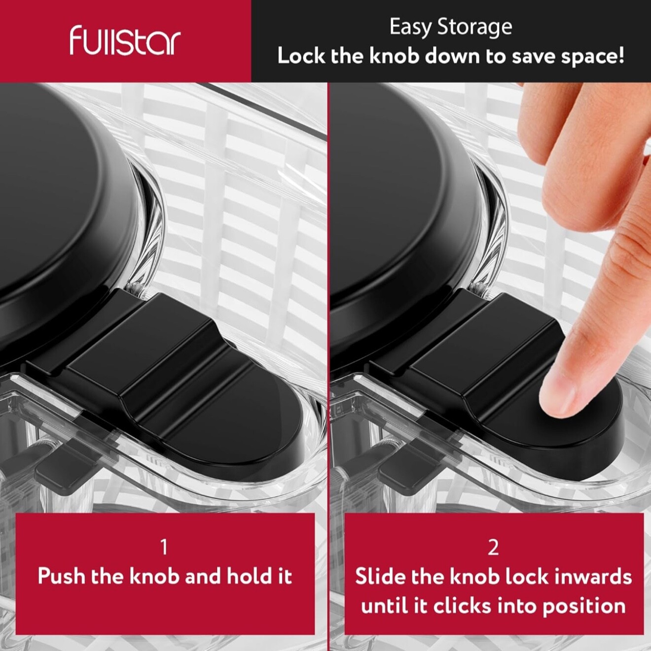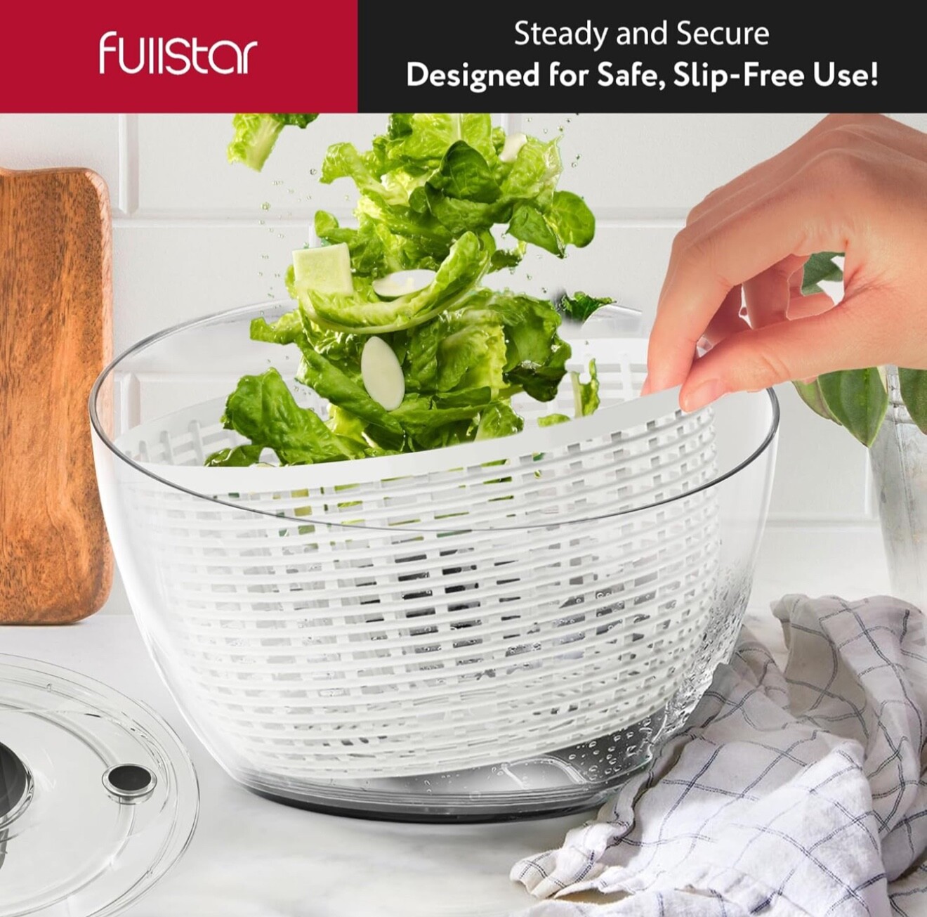 Revolutionary One-Hand Pump Design : Simplify salad prep with Fullstar’s innovative one-hand pump mechanism, transforming the spinning process into a quick and enjoyable task. • Secure and Stable Operation : Designed with a non-slip base for stability, this spinner ensures safe, efficient use as a fruit washer, lettuce spinner, or veggie dryer. • Generous Capacity for Family Meals : The 6.3-quart capacity is perfect for prepping large salads and fruits, while the compact storage lock design keeps it cabinet-friendly. • Versatile and Multi-Purpose : Doubles as a clear serving bowl and colander basket. Use it as a fruit cleaner spinner, vegetable washer, or fruit spinner dryer for fresh, ready-to-eat meals. • Easy to Clean : Dishwasher-safe bowl and basket ensure hassle-free cleaning, with the lid requiring a gentle handwash for optimal maintenance. • Premium Quality & Safe Materials : Made with BPA-free, durable materials, Fullstar’s salad spinner combines health-conscious functionality with top-notch quality. Elevate your kitchen with the Fullstar Salad Spinner —a versatile, durable, and space-efficient tool for every healthy home!