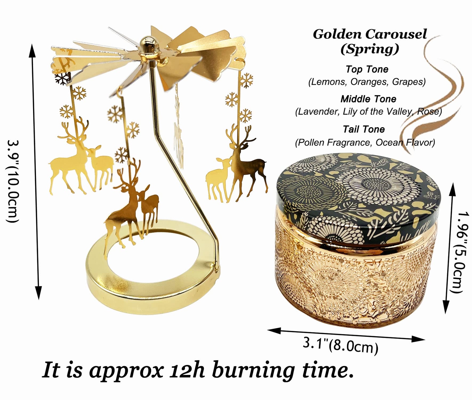 Size: Diameter 3.1"(8.0cm), height 5.9"(15.0cm), weight 0.47lbs(217g) each. You will recieve 1pc glass jar candles with Spinning Deer, the raised pattern on the glass jar, looks artistic and exquisite. The burning time is approx 20h. Golden Deer: Our unique jar candle combines the Spinning Deer with the essential scented candles every home. After assembly, light up the candle, the Trojan starts to spin under the influence of thermals, flickering candlelight, it is so romantic and sweet. When the candle is finished, you can use the jar as candle holder, put a candle in it and light up, Spinning Deer will spin again. The Scent of the Candle: Golden Deer(Laurel), top tone (Elegant, Sweet), middle tone(Ambergris, Violet), tail tone (Sweet, Laurel). Double enjoyment of sight and smell, Perfect decorate your bedroom,study room,washroom,kitchen. Eco Friendly: Our candles are made with 95% soy wax and 5% plant (provide scent).A lead-free cotton wick, providing a cleaner, longer lasting burn. They are infused with natural premium grade plant fragrances, and contain no dyes or paraffin. The multiple natural fragrance make you relax and enjoy, healing effect. Perfect Gift Set: This scented crystal candle set comes beautifully gift packaged. Perfect for Birthday gifts, Mothers day gifts, Christmas gifts, Anniversary gifts, or Thanks Giving day gifts. We are sure that they will love the unique gift.