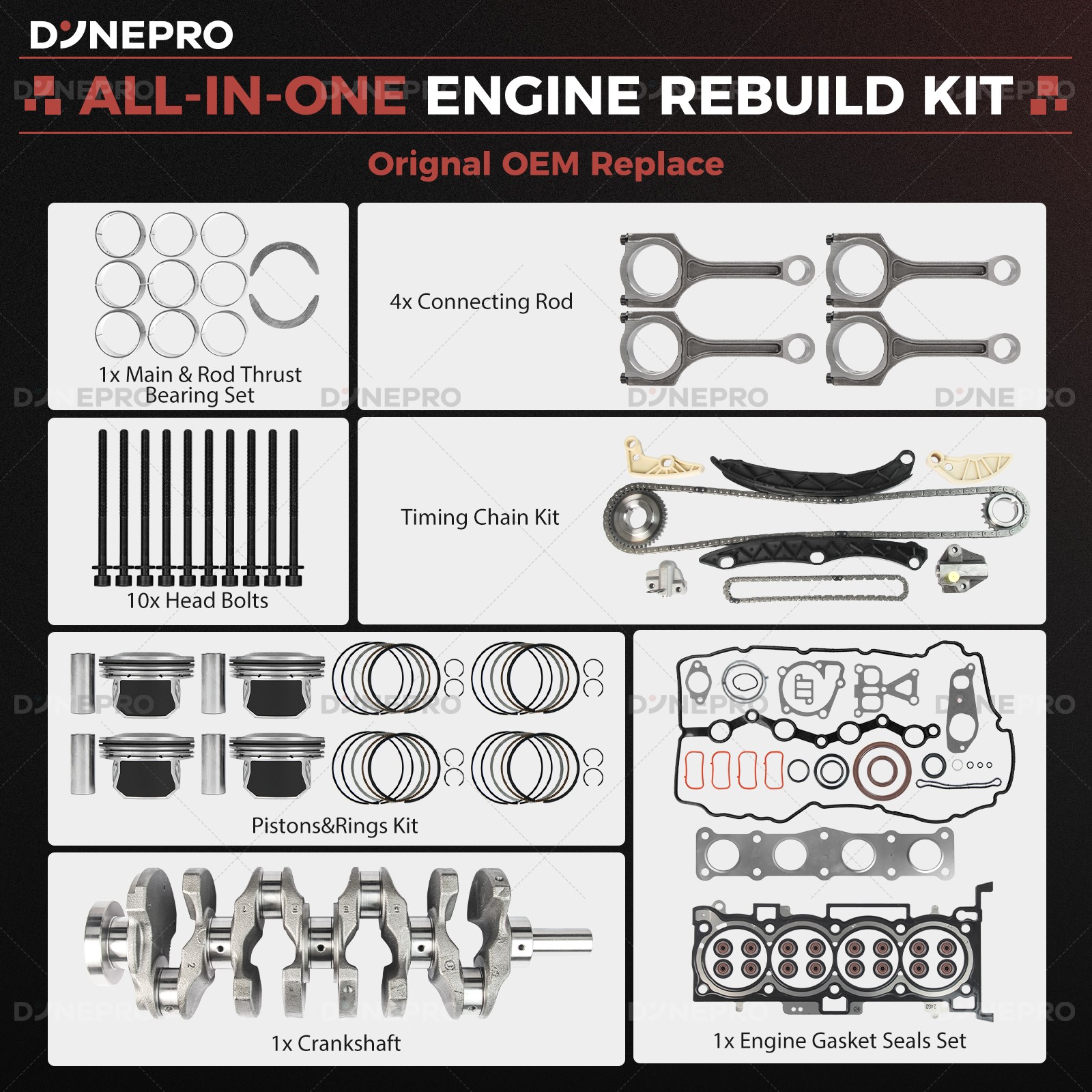 Engine Parts Installation Guide About Us Contact Us Feedback Dynepro® Pro Series Master Engine Rebuild Kit For Hyundai OEM Spec Certified Engine Repair Kit Precision Engineered · Factory Reliability ⭕Crankshaft Assembly Forged from EN40B High-Tensile Alloy Steel , precision-balanced to ±0.002mm. Triple-stage induction hardening ensures 500,000+ cycle durability for Hyundai’s Smartstream GDI engines , 3x lifespan . ⭕Aluminum Piston Set Hypereutectic Al-Si18 Alloy : Low thermal expansion, 20% lighter than cast iron. Molybdenum-coated skirts : Reduces cylinder wear by 35% in stop-and-go city driving. Integrated cooling channels : Optimized for turbocharged Gamma/Theta II engines,lifespan by 2x. ⭕ Cylinder Gasket Set Five-layer composite structure: 0.1mm stainless steel liner (resists high-pressure deformation) Aramid fiber sealing layer (withstands 350°C continuous thermal shock) Graphite coating (self-adapting micro-gap filling) Passed 100,000 thermal cycling tests for factory-grade sealing. ⭕ Timing Chain Kit Duplex Steel Chains : 30% stronger tensile strength vs. standard chains. PTFE-coated guides : Silent operation even at -30°C cold starts. Laser-etched alignment marks : Foolproof installation for D-CVVT systems. ⭕ Built For Hyundai Owners: ✔️ Oil sludge cleanup (Theta II/Lambda engine rebuilds) ✔️ Timing chain rattle fixes (Nu/Gamma engines, includes tensioner tool) ✔️ Turbo failure prevention (1.6T/2.0T models, full gasket/seal refresh) ✔️ 200,000km+ overhauls (full bolt kit with factory torque specs) ⭕ For Hyundai TechTrust : ✔️ Restore factory power. Drive with Korean precision. ✔️Order Now – Free OEM Repair Manual Included! Support: Email us (Master Techs on call) ⭕ Why Genuine? ⚠️ Cheap parts fail: Non-genuine pistons crack under GDI’s 150-bar fuel pressure. Knockoff chains stretch, causing valve-piston interference. ✅ for Hyundai spec Certified : 100% material compliance with Hyundai MS-350 durability standards. Direct from OEM Plant spec suppliers. 5-year unlimited-mileage warranty. Vehicle Application Compatible with: G4KJ 2.4L engines. For 2011-2012 Hyundai Santa Fe 2.4L; For 2013-2015 Hyundai Santa Fe Sport 2.4L; For 2011-2014 Hyundai Sonata 2.4L; For 2010-2013 Kia Forte 2.4L; For 2010-2013 Kia Forte Koup 2.4L; For 2013 Kia Forte5 2.4L; For 2011-2015 Kia Optima 2.4L; For 2007-2011 Kia Rondo 2.4L; For 2011-2015 Kia Sorento 2.4L; For 2012-2016 Kia Sportage 2.4L Note: VIN confirmation required. What's included in this complete bundle set -Full Gasket Set -Main Bearings -Rod Bearings -Thrust Washers -Pistons -Piston Rings -Timing Chain Kit -Connecting Rods -10 Cylinder Head Bolts -Crankshafts Shop Now >> Instant Fitment Email your Hyundai model (e.g., Elantra, Tucson, Santa Fe) and year → Get a repair kit tailored to your VIN. Restore factory power, drive like new. Tech Support: Email us (Provide VIN for tailored parts list) Learn More Learn More Learn More PAYMENT We accept eBay managed payments for all orders. If you have any questions, please contact us. SHIPPING Ordering this kit requires additional information: the vehicle engine model as well as the VIN (17 digits), and also requires you to verify a match to your vehicle using the vehicle application data on Ebay. Be sure to provide this information when placing your order or via a separate message. Product will be shipped within 1-3 business days after full payment is received and verified. Delivery Time is about 3-7 business days to most of countries. We ship the package to your shipping address in eBay instead of the one in PayPal. Please tell us your shipping address if it is different from the one in eBay. RETURNS We offer eBay's best return policy. If you utilized Ebay's fitment and the parts you received do not fit your vehicle, we will pay to have them returned. Should you desire to return this kit for any other reason, Includes kits that are incorrect because you did not provide the VIN in the order notes, you will be responsible for return shipping. These kits are heavier and cost more to ship, so we ask that you provide vehicle information and verify suitability before ordering.Unfortunately, we cannot accept returns from international customers at this time. ★★★★★ So far the engine overhaul kit has performed well. I love the performance with this kit installed. On my 2004 F150. Installation was easy. Everything is perfect. Considering this kit is cheap, it doesn't get any better than this. ----James ★★★★★ This was a great price. lt was made in the USA. After 10,000 miles it is running great. ----Liam ★★★★★ As of the time of this review this is well worth the money and it fits as it should. ----Noah ★★★★★ This set was installed perfect fit. lt has been installed on a truck that has been used very much every day. Working perfect and so much cheaper than the auto stores. ----Ethan ★★★★★ Seemed to be a perfect replacement part and it works. ----Oliver ★★★★★ Everything fit how it was supposed to and have been driving it for a week with no problems. ----Benjamin ★★★★★ The seller was very nice and provided me with professional advice on the installation, which was a breeze and is still going strong after 10,000 miles. ----Michael On Jul 22, 2025 at 02:25:56 PDT, seller added the following information: