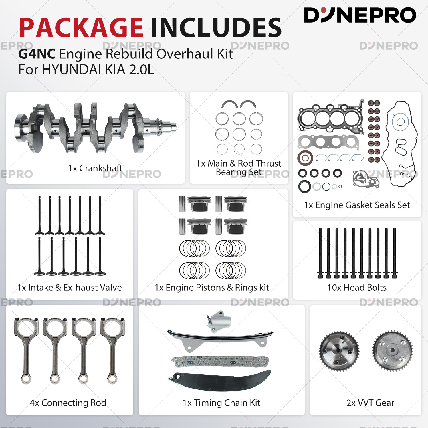 This G4NC 2.0L rebuild kit is a game-changer for Hyundai and Kia owners! Everything you need is included—gaskets, pistons, bearings, and even a timing chain kit—all precision-engineered to OEM specs. Installation was smooth thanks to the detailed guide, and the quality feels just like factory parts. My Elantra GT runs like new now, with no leaks or hiccups. Perfect for DIYers or shops looking for reliable, complete engine overhaul parts. Highly recommend for a solid, budget-friendly rebuild!