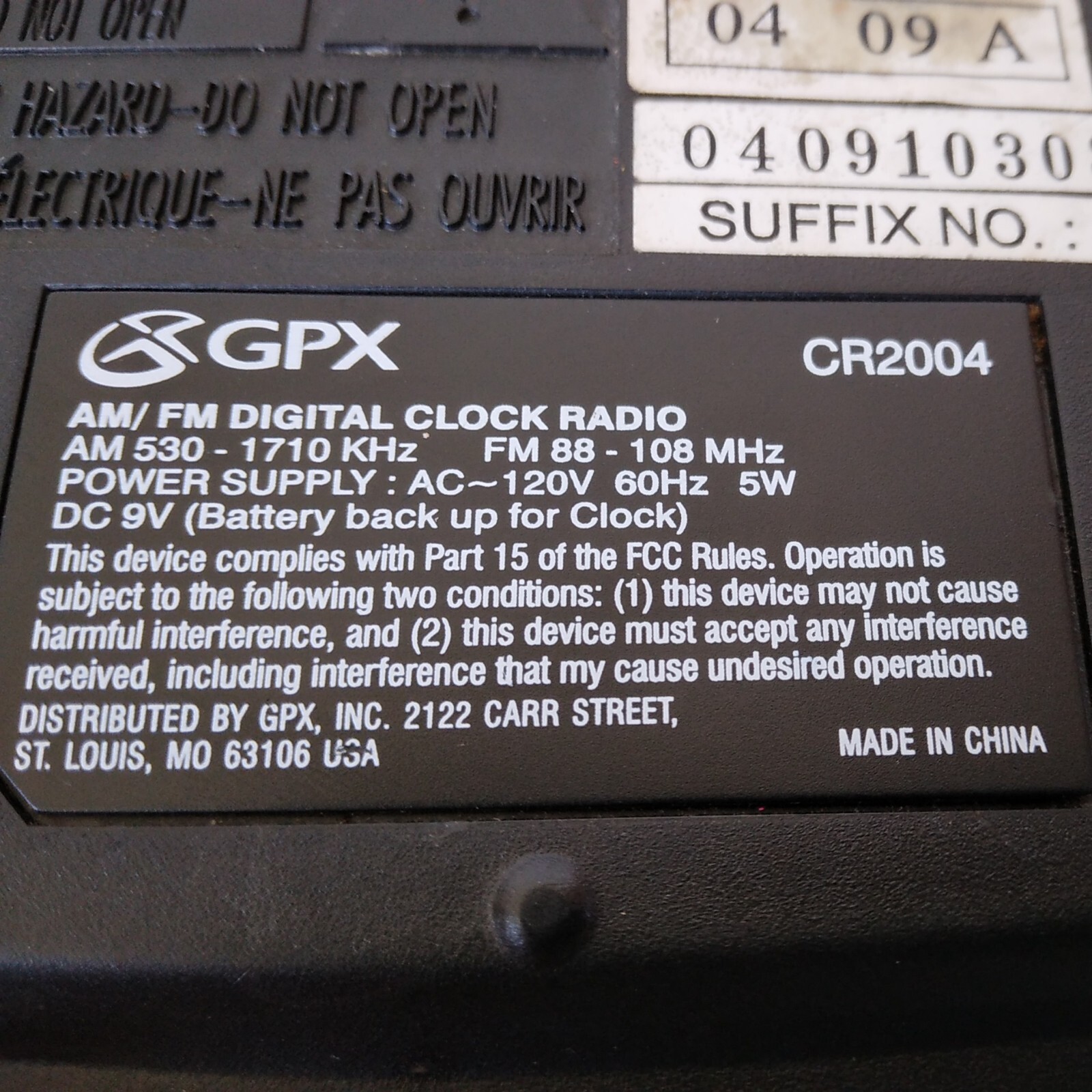 GPX CR2004 Digital Alarm Clock. This clock has been tested on all functions and works well. The alarm is a repeating loud buzz. This clock is in good cosmetic condition aside from a few small scratches and a flaw on the right of the clock face edge. See pictures for a closer look. Will ship well protected. Thanks for the interest.