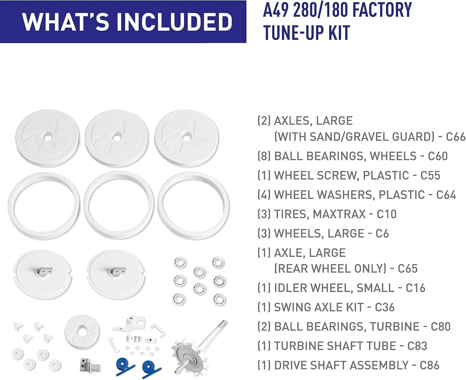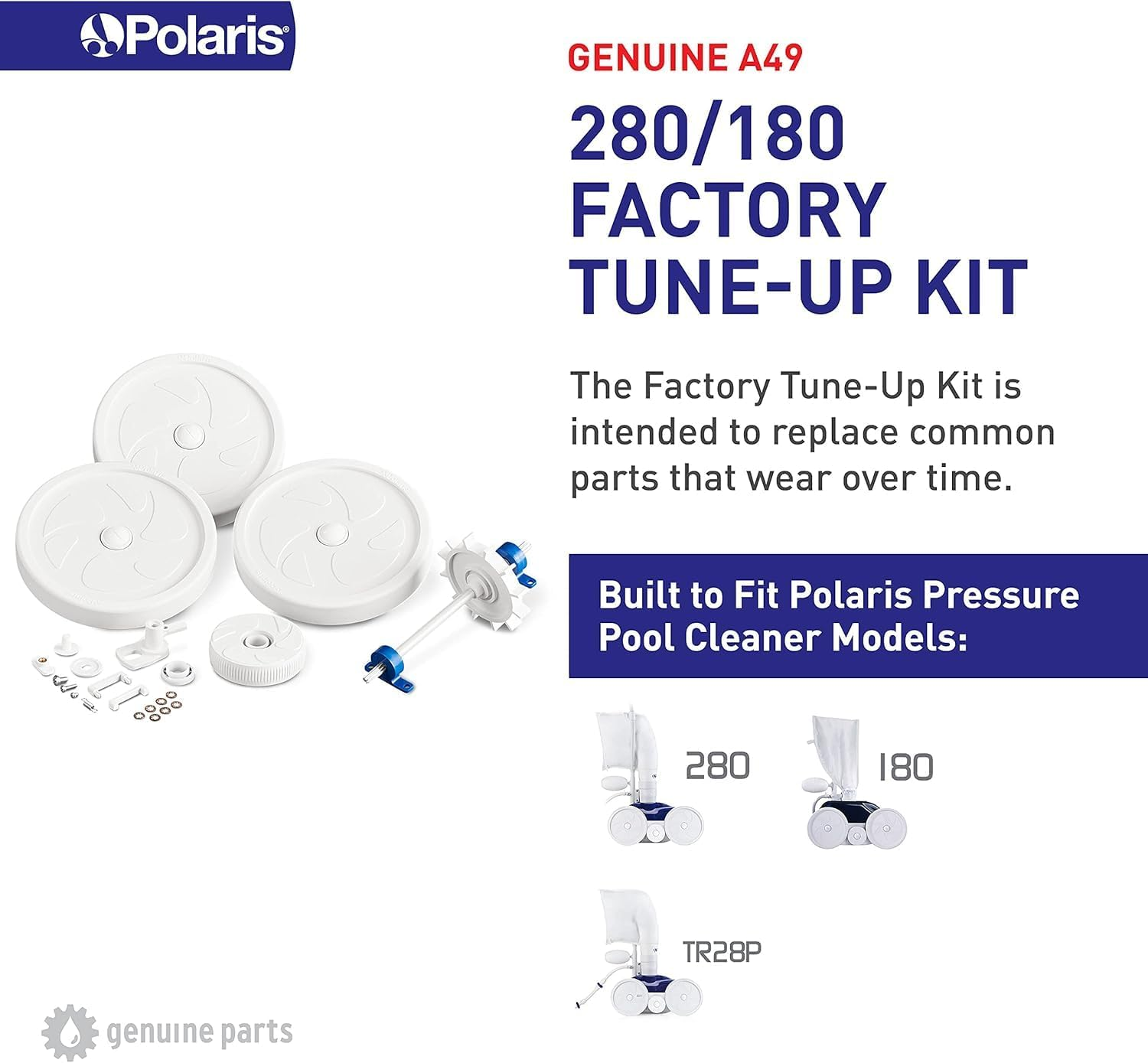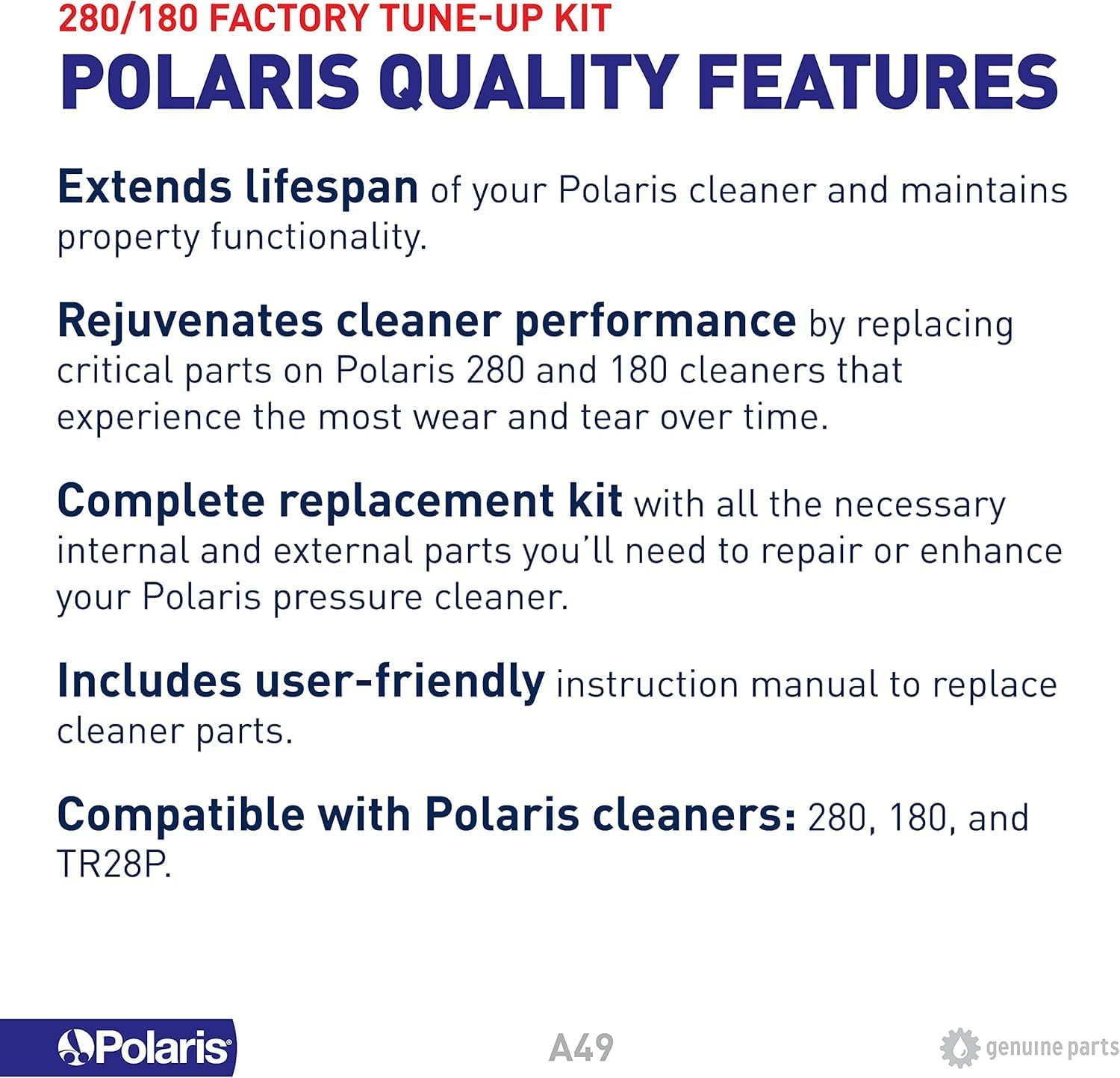 Store New Arrivals Add to Favorite View Feedback Contact Genuine Parts 280/180 Factory Tune up Kit, A49 Description Item model number A49 Item Weight 1 pounds Power Source AC Assembly Required Yes Efficiency Efficient, High Suction Power, Long Battery Life Color White Special Feature Quiet Operation Product Dimensions 5.5"L x 16.5"W x 8"H Material Plastic Control Method Touch Warranty Type Limited Global Trade Identification Number 00738919001244 Installation Type User Installation Model Name 180/280 Tune Up Kit Year 49 Is Discontinued By Manufacturer No COMPATIBILITY: Engineered specifically to fit Polaris models 280, TR28P and 180 PREMIUM PERFORMANCE: The Polaris Factory Tune-Up Kit is for replacement of common wear parts on authentic Polaris 280 and 180 pressure cleaners. With so many spare parts included, this kit is great for giving your cleaner a refreshed life again. WHAT'S INCLUDED: Wheels (large and small), wheel screw, wheel washers, bearings, axles, swing axle, tires, small wheel, turbine shaft tube, and turbine bearings and drive shaft assembly. WARRANTY: Using only Polaris genuine parts helps maintain the Polaris cleaner’s manufacturer limited warranty. Purchased Polaris genuine parts come with a 90-day limited manufacturer warranty from date of retail purchase. POLARIS GENUINE PARTS: Made with high-quality materials and built to exact engineering specifications to ensure a long life with exceptional performance. For over 40 years Polaris has led the pool industry in quality pressure-side cleaner manufacturing. The Polaris Factory Tune-Up Kit (A49) is built for authentic 280 and 180 Polaris pressure-side pool cleaners - the global leader in pressure cleaning and is intended for replacement of common Polaris 280, TR28P and 180 parts that wear over time. Using only Polaris genuine parts maintains the Polaris cleaner’s manufacturer limited warranty. Purchased genuine parts also come with a 90-day limited warranty. For warranty support on original equipment or Polaris genuine parts contact Polaris directly with proof of purchase. ABOUT US We offer the best prices around on high quality products. Our E-store includes media such as books, movies, music and games while offering electronics, toys, sporting apparel, clothing, tools, general home, garden items and more. SHIPPING We are always working hard to ensure your package arrives as soon as possible. Please understand that some factors like weather, high postal traffic, and the performance of shipping companies are outside of our control. For shipping outside of the continental USA, we only use eBay's Global Shipping Program.The item is shipped to KY and then sent to the rest of the world. International customers are responsible for all duties and taxes. Continue to check out in order to calculate costs for shipping the item to your country. Messages regarding eBay's Global Shipping Program MUST be directed at eBay EXCLUSIVELY. RETURNS We offer a 30-Day Return Policy on items which you are not completely satisfied with. You have the option for a full-refund or an exchange of the item. No returns are available on items shipped outside of the USA. PAYMENT We accept PayPal. CONTACT US This page content is yet to come Please ad us to your favorite seller and visit again later Thank You CUSTOMER SATISFACTION We try our very best to make sure every customer is completely satisfied. If there's a problem, message us! We're happy to help. WE ACCEPT Copyright © 2021 AutoDS. | All Rights Reserved