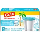 Fight nasty kitchen odors with Glad Small Drawstring Trash Bags and the steady release of Febreze Freshness in Beachside Breeze scent. These green plastic trash bags with Febreze Freshness provide strength plus continuous odor neutralization to keep your whole house smelling fresh and clean. 4 gallon trash bags fit small size trash cans and are great for use throughout busy homes, and for seasonal cleaning like Spring cleaning and back to school. Take the trash to the curb with no fear of leaks and tears, and no frustration. The durable drawstring ensures a tight grip on the trash can to keep it in place, making garbage bags easy to lift, carry and toss away... eBay STORE ABOUT US SAVE SELLER CONTACT US Glad Small Kitchen Drawstring Trash Bags, 4 Gallon, Blue, Febreze Beachside Breeze, 80/Box (79155) - Sold as 80/Box Fight nasty kitchen odors with Glad Small Drawstring Trash Bags and the steady release of Febreze Freshness in Beachside Breeze scent. These green plastic trash bags with Febreze Freshness provide strength plus continuous odor neutralization to keep your whole house smelling fresh and clean. 4 gallon trash bags fit small size trash cans and are great for use throughout busy homes, and for seasonal cleaning like Spring cleaning and back to school. Take the trash to the curb with no fear of leaks and tears, and no frustration. The durable drawstring ensures a tight grip on the trash can to keep it in place, making garbage bags easy to lift, carry and toss away. Keep your kitchen smelling clean with the stretchable strength of Glad. • 4 GALLON BLUE PLASTIC TRASH BAGS: Handle daily household and everyday demands with Glad's small sized 4 gallon garbage bag. • DRAWSTRING TRASH BAG: The drawstring closure ensures a tight grip on trash cans and makes for a simple removal with a quick cinch of the durable drawstring. • LONG LASTING ODOR CONTROL: Be the champion of trash with these durable bags that keep your kitchen free of noxious trash odors with a steady release of Beachside Breeze with Febreze Freshness. • GARBAGE CAN LINER: Glad 4 gallon trash can liners are ideal for small trash cans, general household needs and are just the right size for cars and on-the-go travel. • CLEANING MADE EASY: Glad 4 gallon small trash bags supports an active household and provides a versatile plastic bag to tackle everyday demands. Usage Directions: Lift the trash bag from the container by pulling the drawstrings on either side of the bag. Knot the drawstrings for added security. Carry the bag by the drawstring and toss into garbage. Caution Statement: To avoid danger of suffocation, keep all plastic bags away from babies and children. Do not use plastic bags in cribs, beds, carriages or playpens. • Sold as 80/Box. You may be interested in our other listings on eBay.
