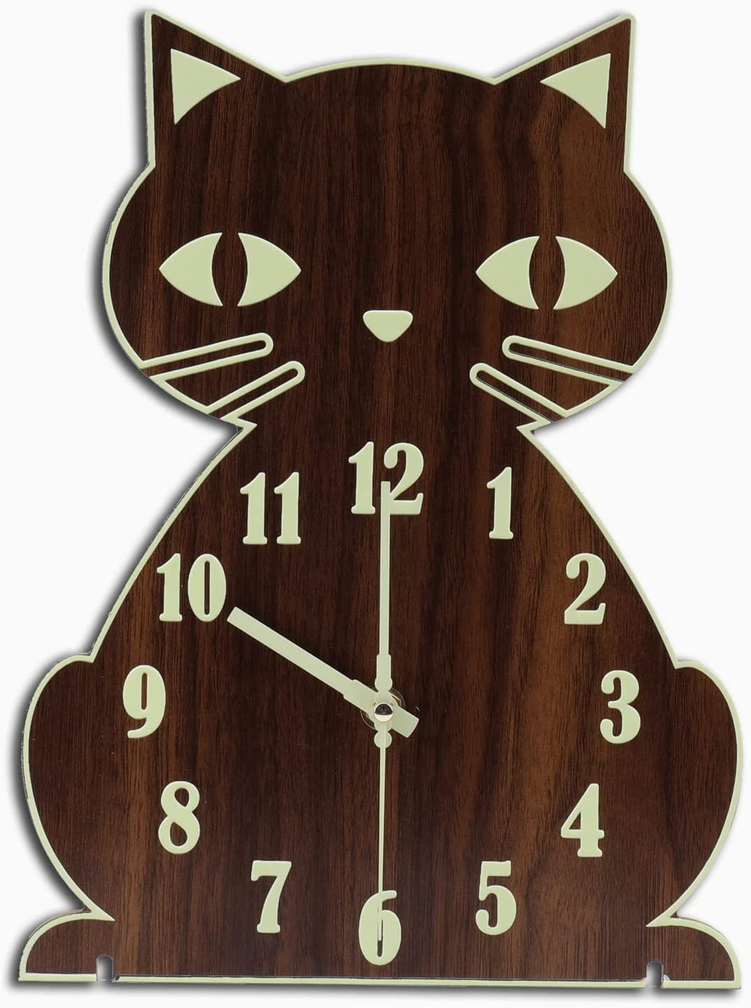 Wall Clock Glow in the Dark Night Light Cat Wall Clock Silent Non-Ticking Wooden [Night Light] - The wooden wall clock can absorb light energy at day and glow in the dark. The glow time depends on the light absorbed in the day. The more the absorbed light source, the longer the intensity and duration of the night light. [Cute Cartoon Style] - With cat theme, blessing function of night light,the cat clock can be used as a nice room decoration, suitable for living room, study room, bedroom, kitchen, office, etc. [Wooden Wall Clock] - It's made of special brown MDF (Medium Density Fiberboard) material, metal pointers,no glass,no frame.It's simple and elegant clock. [Easy to Read ] - 12 Inch glow in the dark wall clock with large bold numbers make it easy to see from any corner of your room.Even the elderly or people with poor eyesight can see very well. [Non-ticking & Silent] - Precise quartz sweep movement guarantees accurate time and absolutely silent environment. [Nice GIft] - Lovely shape, glow in the dark / luminous , bring convenience to your life,it's nice gift for cat lover,friends,family,elderly,children etc.You can send your sincere wishes and greetings to your friends' birthday parties, company celebrations, Christmas, Mother's Day, Father's Day, etc 12.0 "h x 8.8 "h. Weight: 12.7 oz Item model number CCNL-12BN Style Art Deco Number of Items 1 Power Source Battery Powered Country of Origin China Theme Cat Are Batteries Included No Product Dimensions 8.8"W x 12"H Material MDF Wood Shape Cat Frame Material Wood Watch Movement Quartz Indoor/Outdoor Usage Indoor Item Weight 12.7 ounces Special Feature Illuminated Display Type Analog Mounting Type Wall Mount Color Brown Operation Mode Electrical Alarm Clock No
